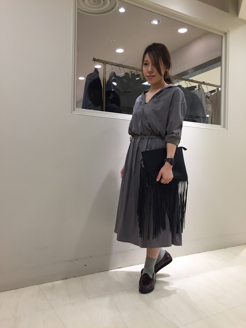 今月号のバイラに掲載されている 綺麗めワンピースのご紹介です。 こだわったシルエットが スタイルを良く見せてくれるので 1枚で着こなせるアイテムです。 コーディネートに困らないワンピースは 1枚あると便利ですよね☆ ローファーと靴下を合わせ 今使えるコーディネートを 組んでみました。