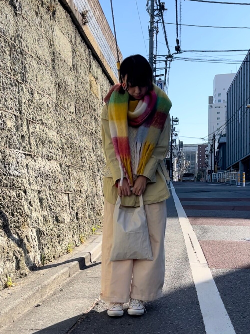 もうすぐ12月なのにまだお昼はあったかい日もありますねー。 気軽に巻いたりかけたりできるストールは大活躍◎ シンプルコーデにチェックがよく映えます◎