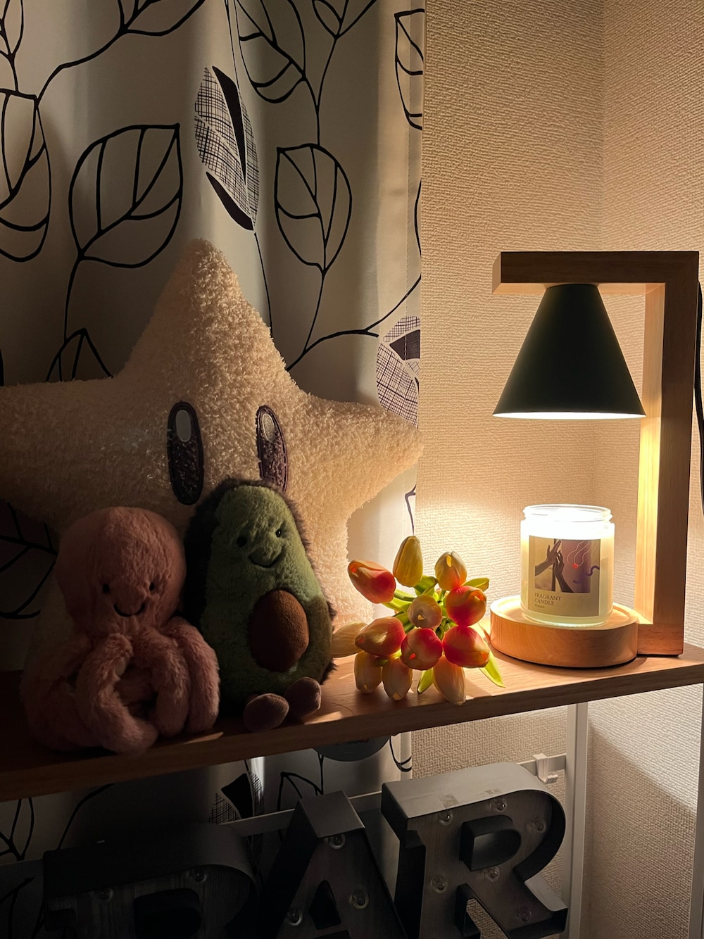 お部屋の片隅にお気に入り空間を作った♡ キャンドルウォーマーは光の加減を調節できて、リラックスしたい時とか間接照明にすごくよくて、しかも香りも楽しめるという優れもの!本気でおすすめ!