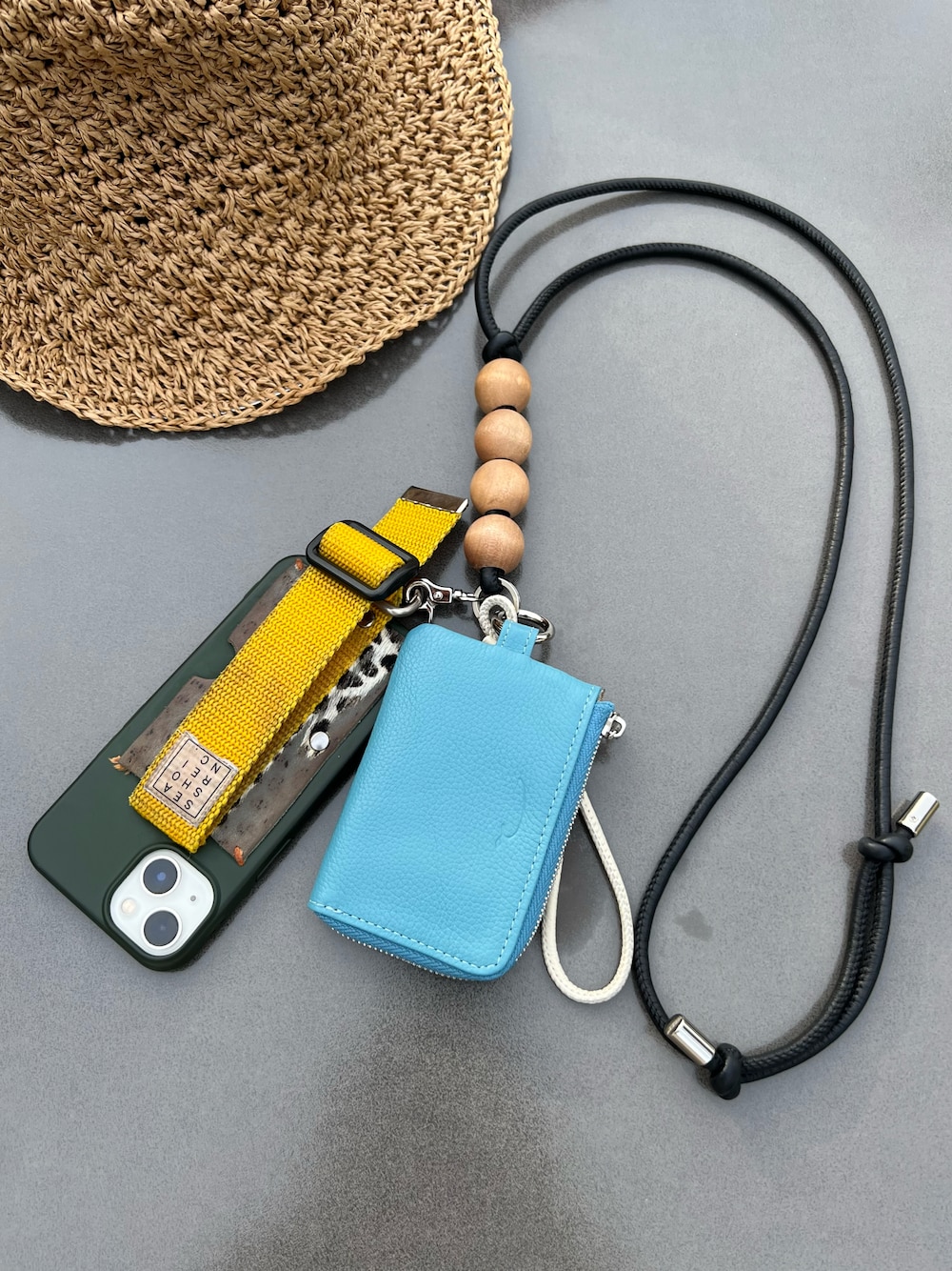 n m k( BIRTHDAY BAR 本部)のスマホグッズ「ウッドビーズ 本革マルチスマホストラップ」を使ったコーディネート
