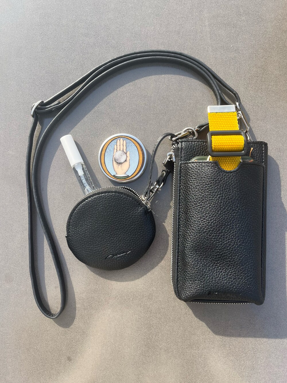 お財布代わりになるスマホショルダーに、ラウンドのコインケースをカスタマイズ。 お財布として、スマホポーチとして、鍵もつけれます。 コインケースにはマルチバームとパフュームを入れて、これ一つで身軽にお出かけできます◎
