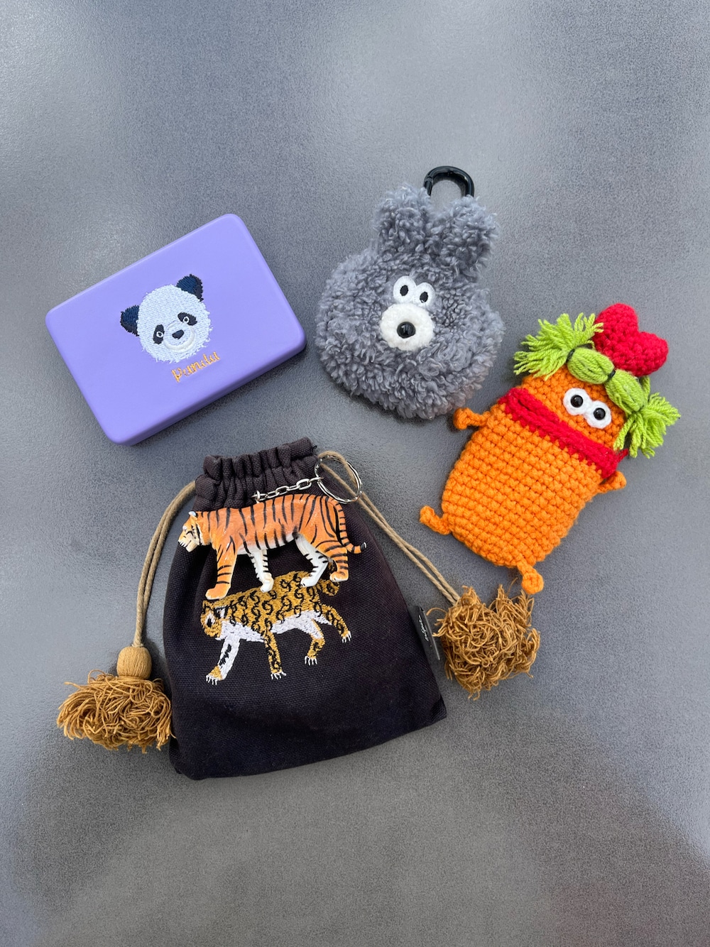 バッグの中身はアニマルモチーフ多め◎ パープルのはアクセサリーケース、グレーはAirPodsケース、オレンジはキーケース、ブラックは巾着。 カラフルでテンション上がる◎
