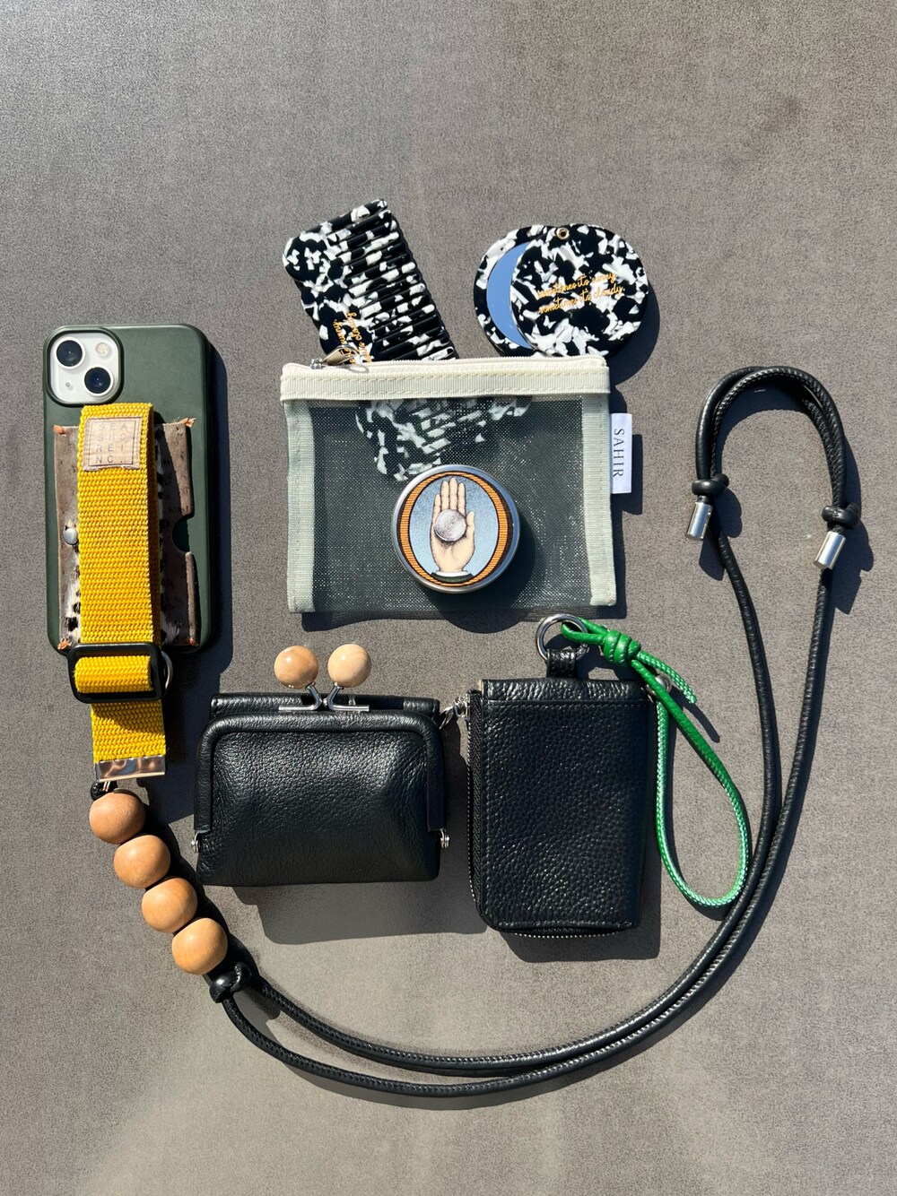 ブラックメインのバッグの中身のご提案◎ スマホストラップとお財布は、おそろいのウッドビーズで持っていただきたい! アセチシリーズは新色でています☺︎