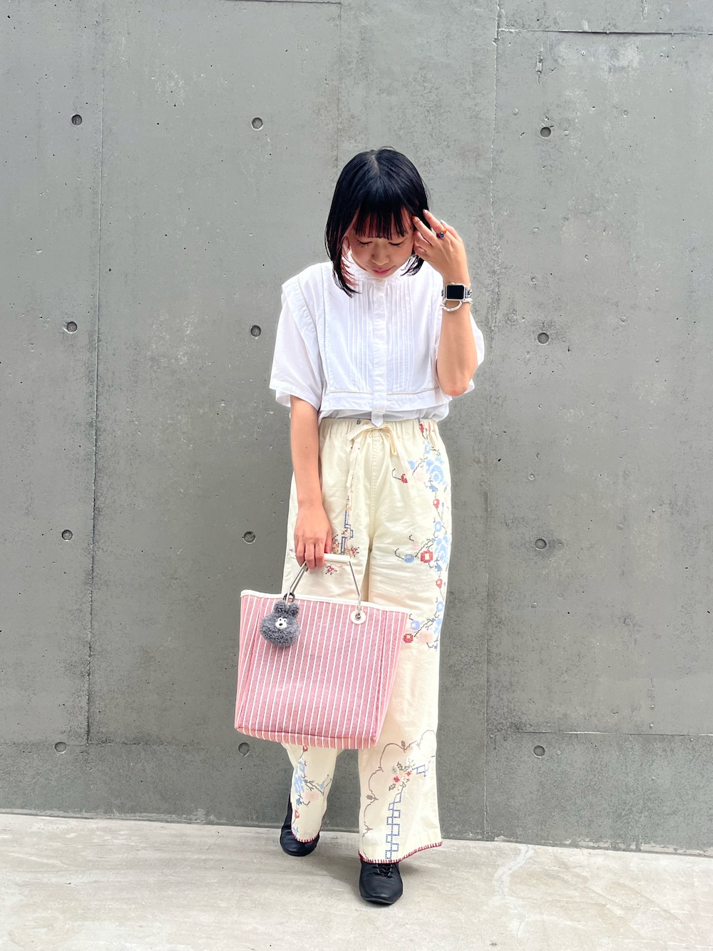 n m k( BIRTHDAY BAR 本部)のトートバッグ「メッシュ×PVC ストライプスクエアトートバッグ」を使ったコーディネート