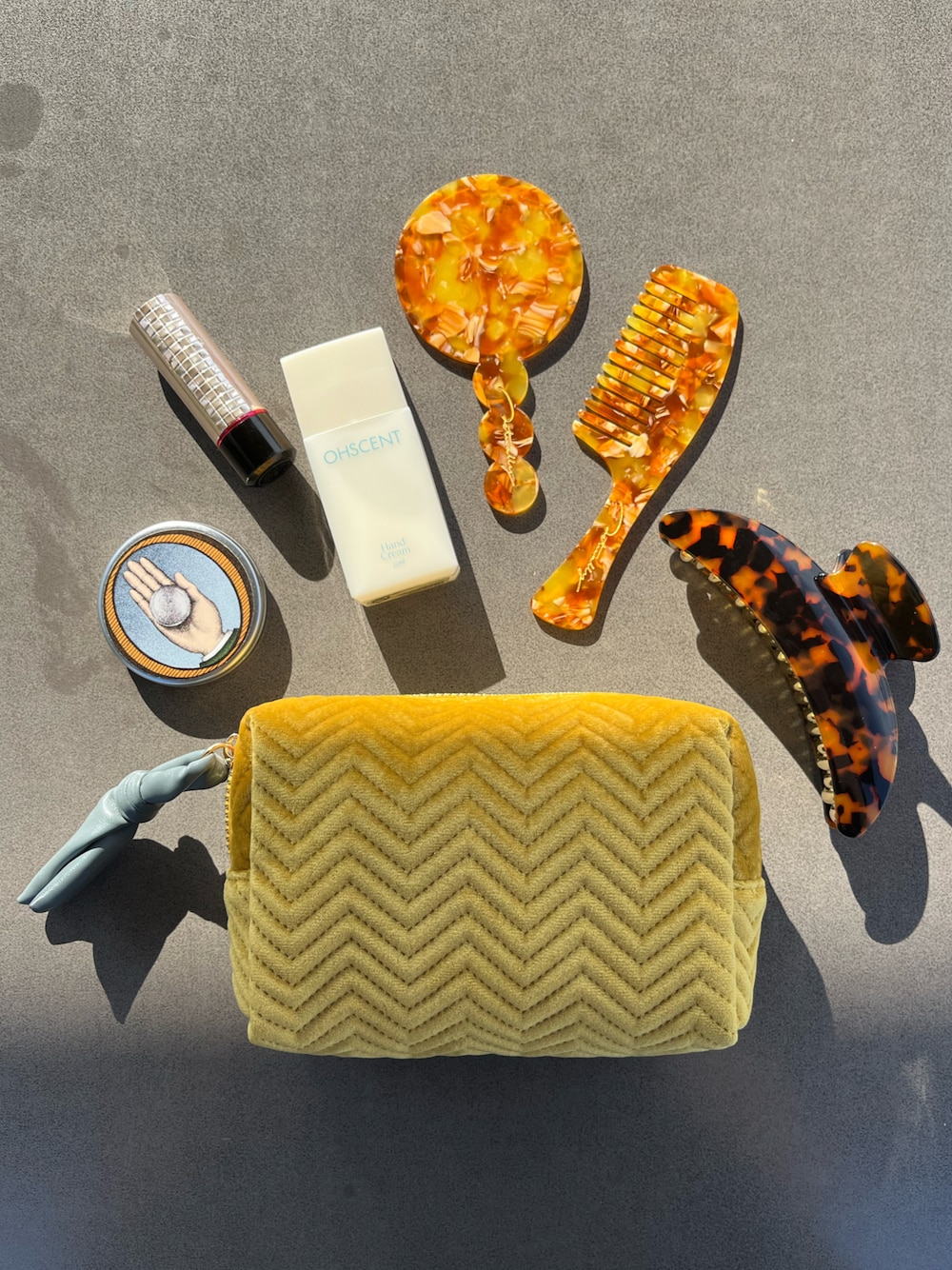 昨年人気だったポーチがバージョンアップでリバイバル! ベロアの温かみある素材で、マチもたっぷりで収納力抜群◎ バーム、リップ、ハンドクリーム、ミラー… すっぽりと収納できます◎