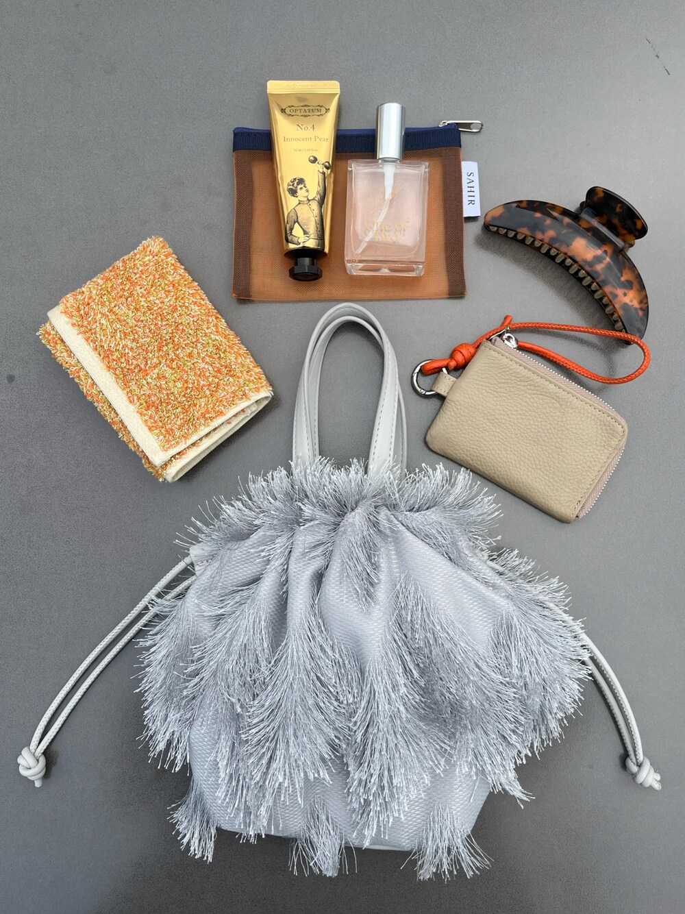 n m k( BIRTHDAY BAR 本部)のトートバッグ「フリンジ巾着バッグ」を使ったコーディネート