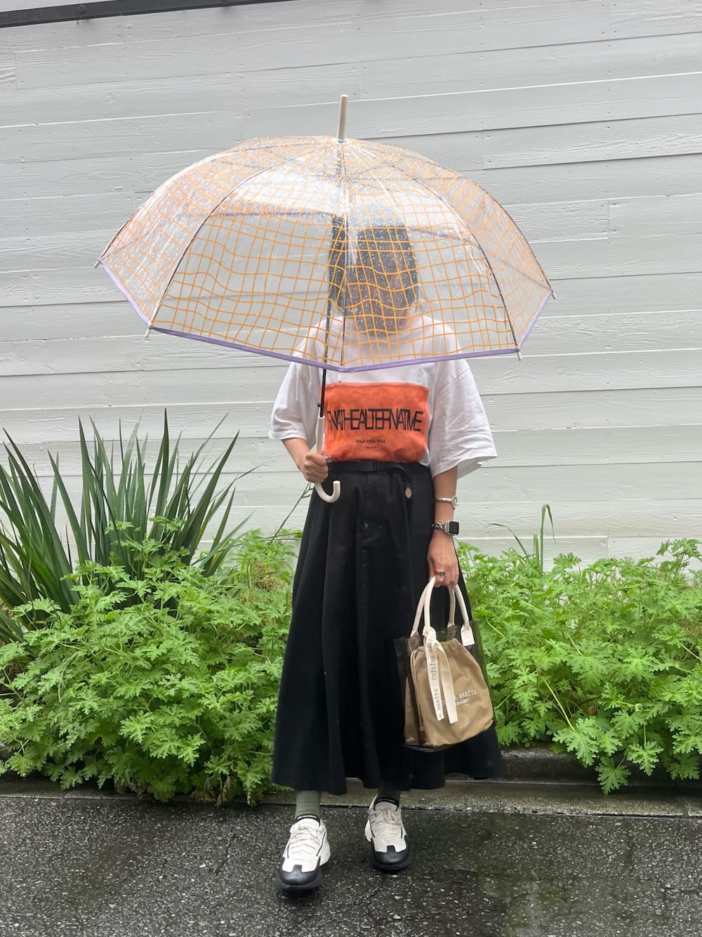 雨の日コーデ。 Tシャツと傘をオレンジで合わせました◎ 傘はジャンプ式で片手でスムーズに開けられるのでストレスフリーです! バッグは雨の日でも持ちやすいPVCトートバッグ。水滴はさっと拭き取れるので、雨の日は特に重宝します。