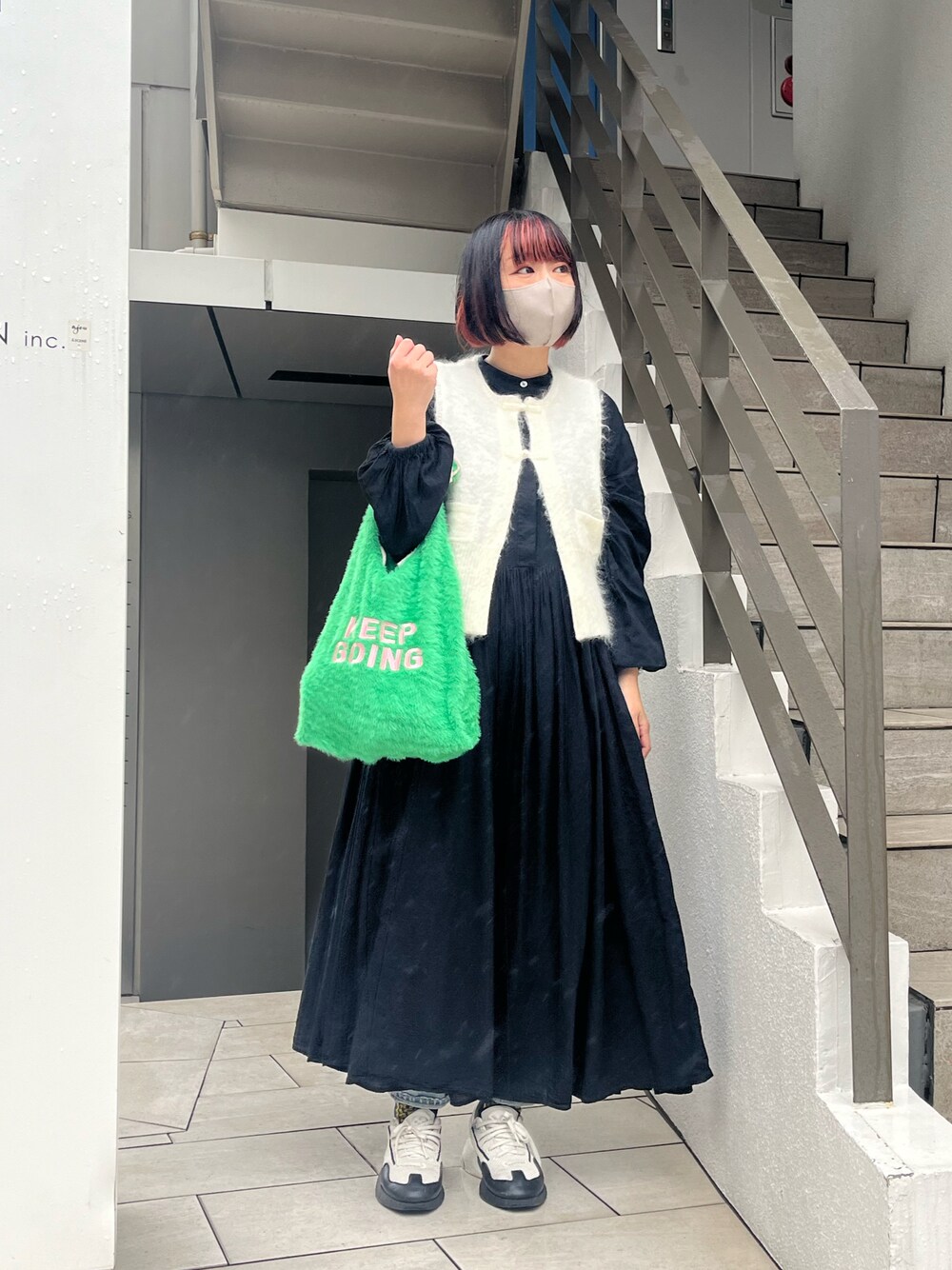 ショルダーを結んで長さ調節出来るので、肩掛けでも手持ちでも◎ モノトーンでカジュアルな服が多い私にはグリーンが差し色になってお気に入り! ふわふわ素材で手触りも