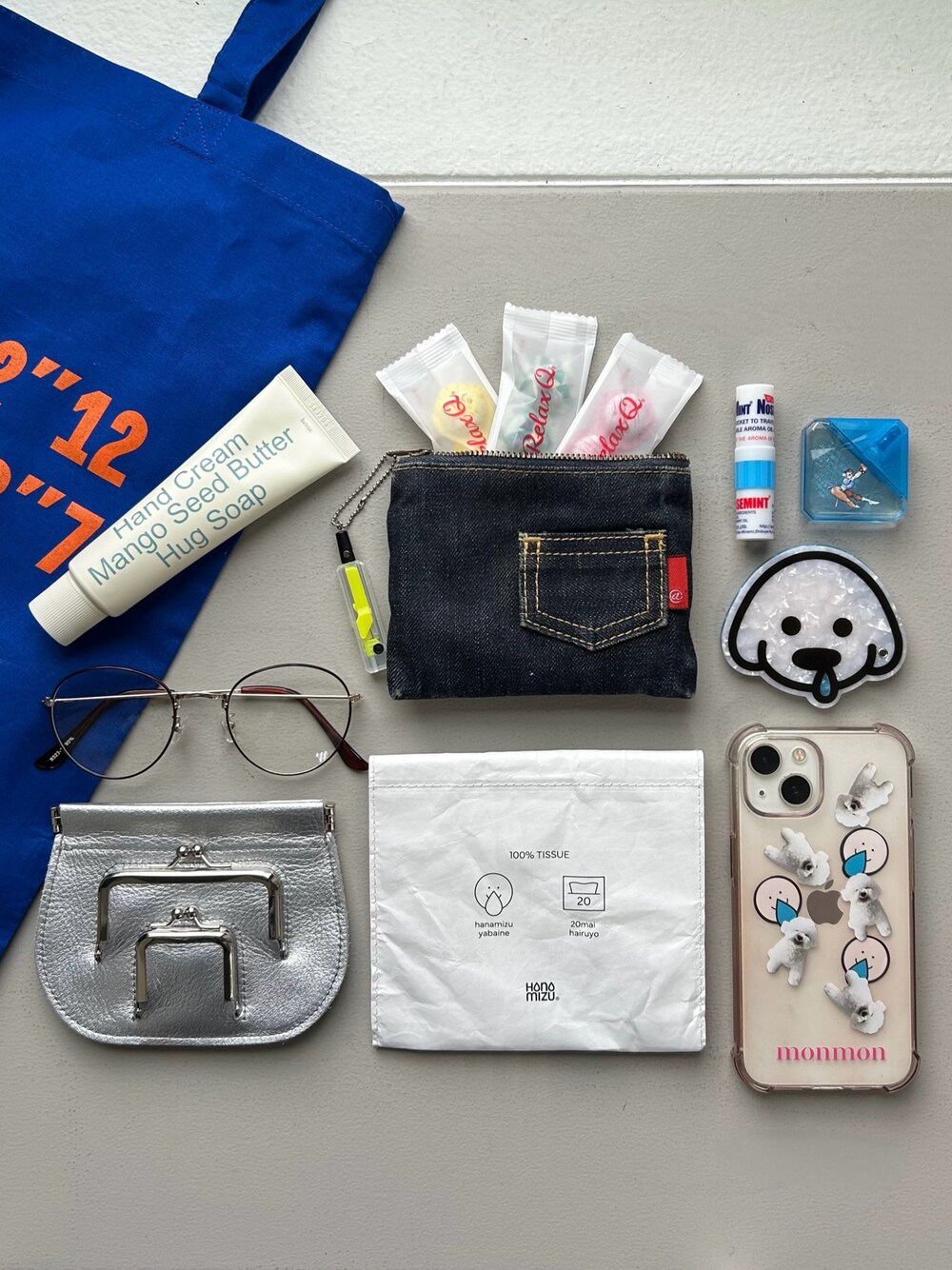 使った後のやり場の困るティッシュを入れれるポーチ!アイデア斬新やしかわいい!! デニムのポーチに入っているのは「ほっとイヤリング」 耳や手の甲や肩につけてじんわり温めてくれます。見えても可愛いデザイン◎ ハンドクリームは韓国産☺️ こちらは石鹸の清潔感ある香りです◎
