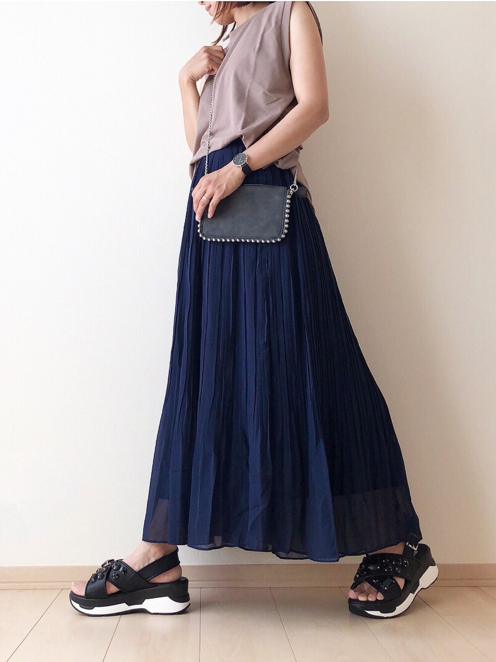モカ × ネイビー ノースリにプリーツスカートに カジュアルなスポサン合わせ♡ Instagram ☞ @nm.ks