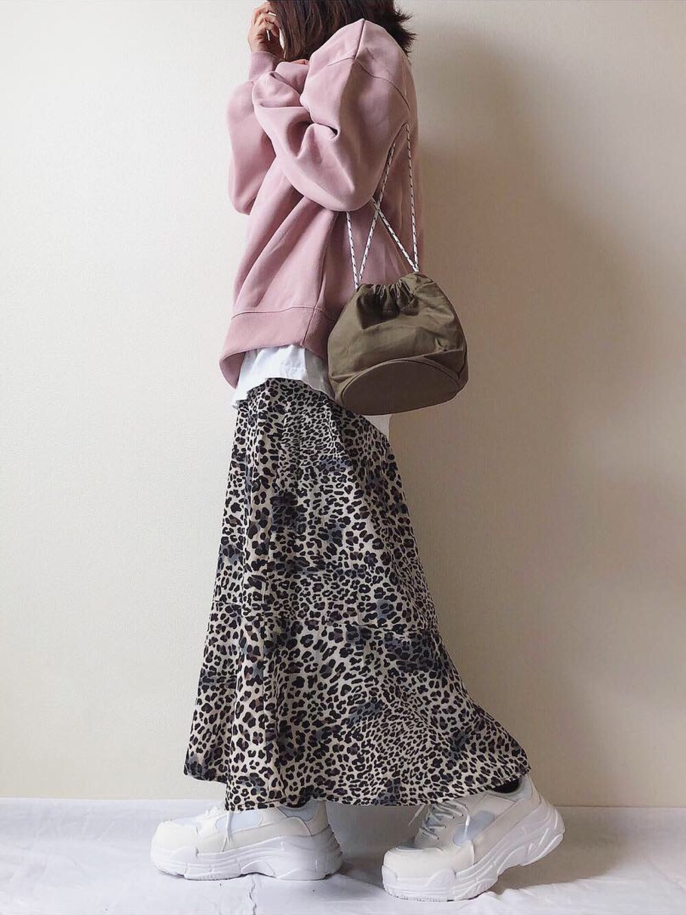 GUのくすみピンクのスウェットに レオパスカート合わせ。 ドノバンのダッドスニーカーもかわいい♡ Instagram → @nm.ks