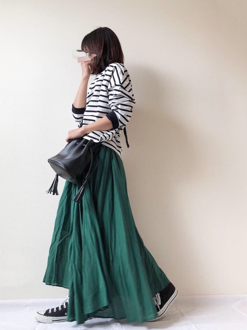 ボーダートップスにマキシスカート♡ このボーダートップス、 肩の落ちたデザインなど絶妙でお気に入り♡ Instagram @nm.ks