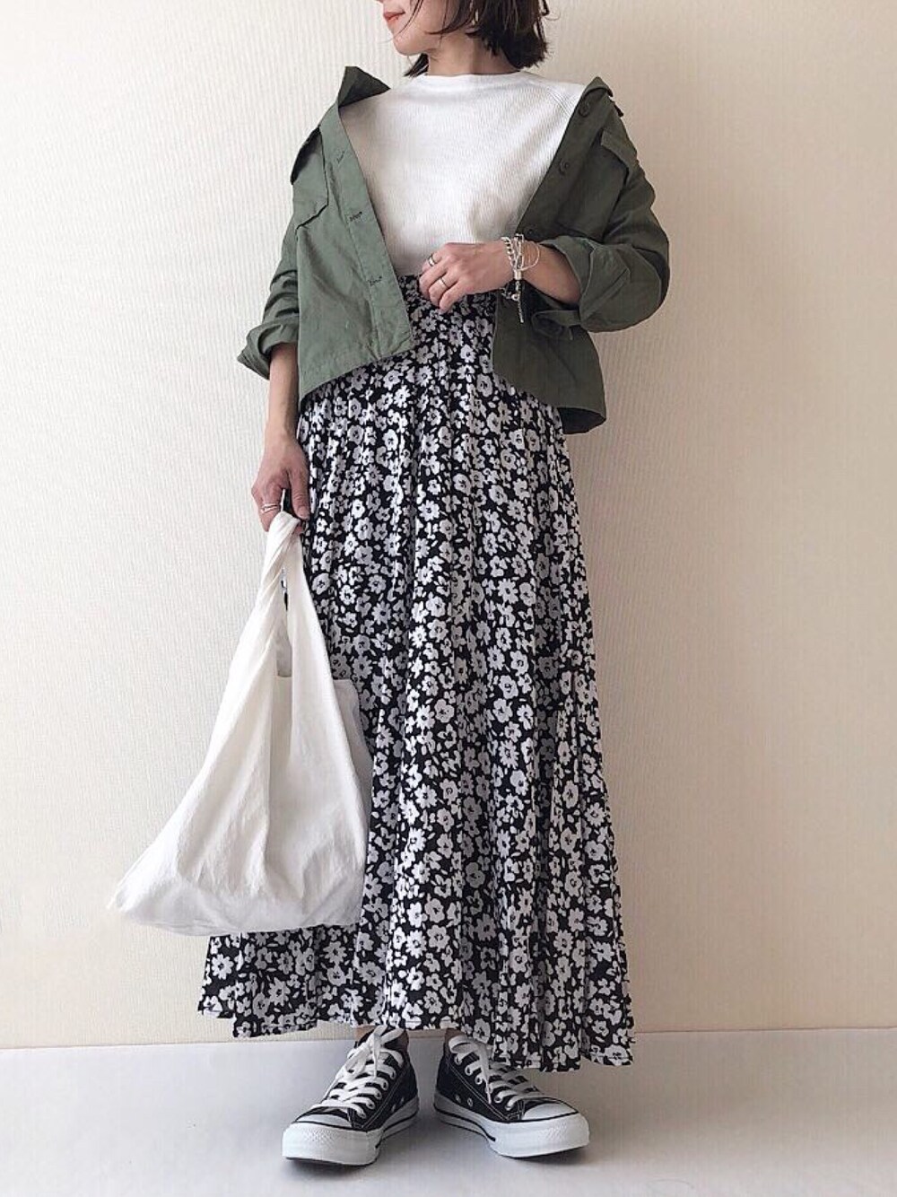 花柄スカートにミリジャケ合わせ Instagram @nm.ks