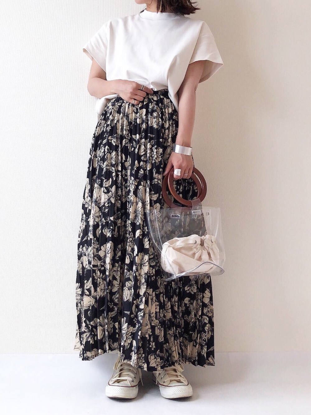 モノトーンコーデ @titivateのプリーツは 花柄だけどブラックだから 甘くなり過ぎなくて良き♡ Instagram @nm.ks