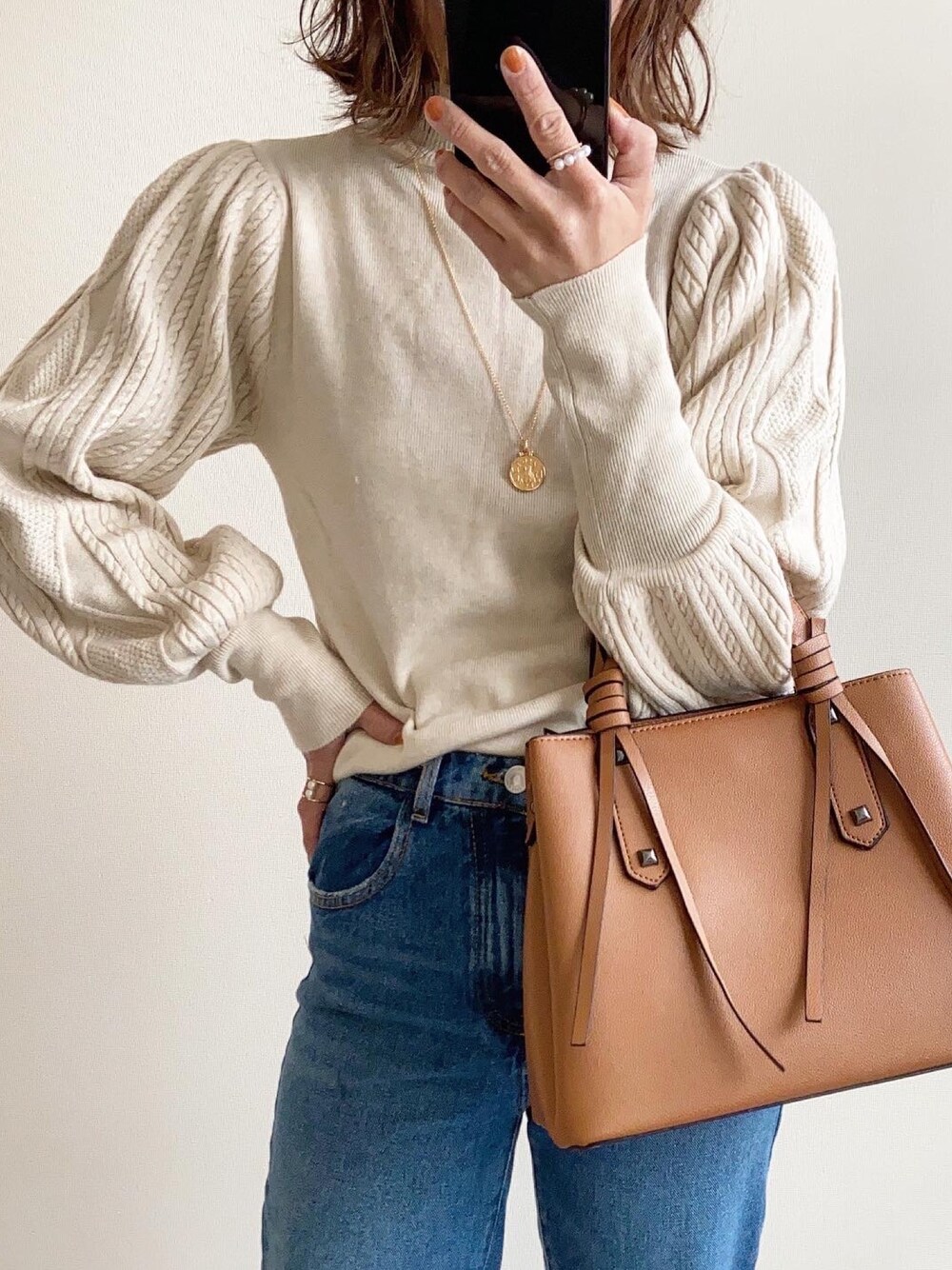 nm73のニット/セーター「ケーブル編みボリュームスリーブニット」を使ったコーディネート
