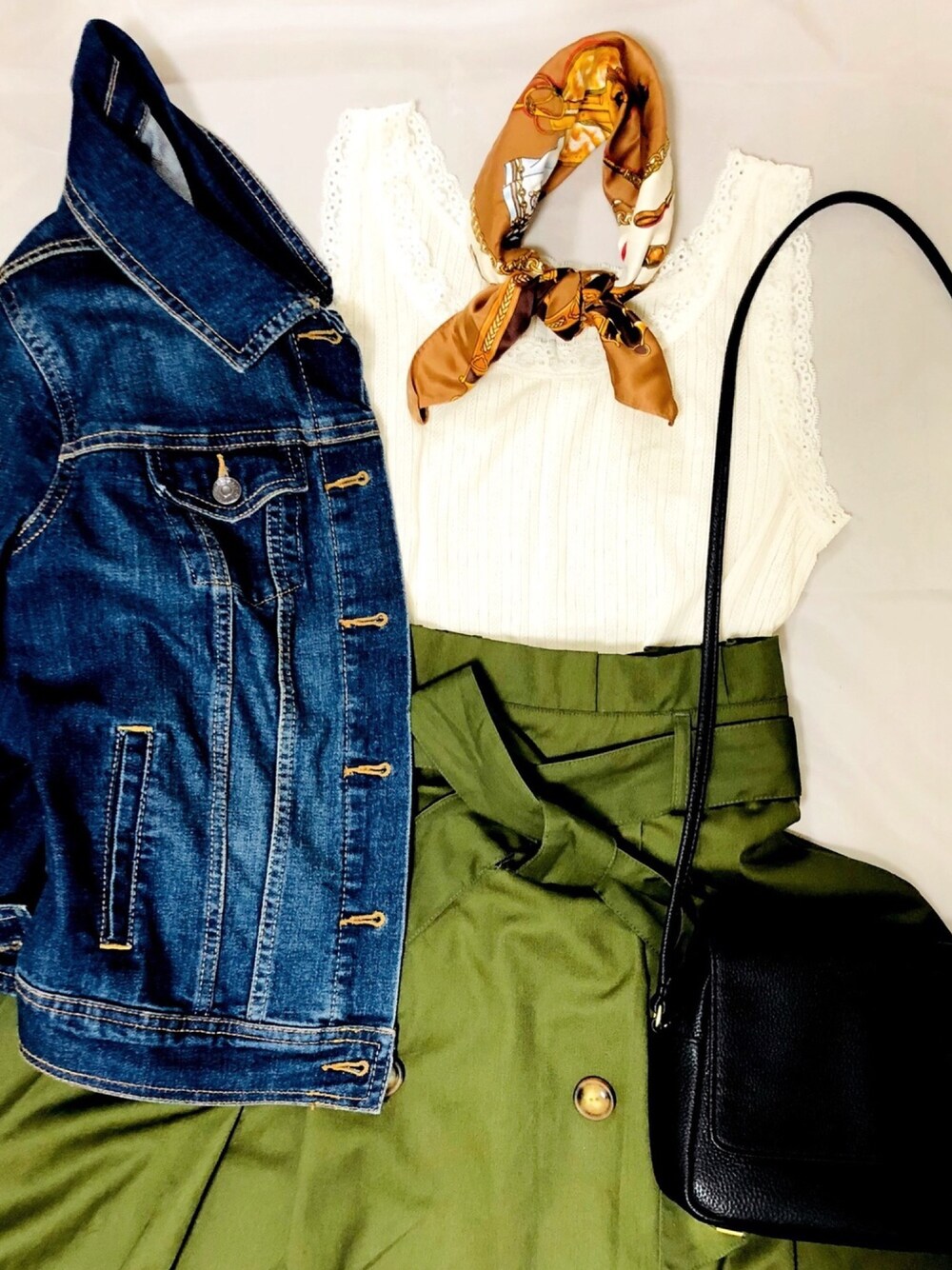 スカーフがアクセントになって 色合いが好き🙆🌷 バッグと靴は黒系でまとめたい🕺