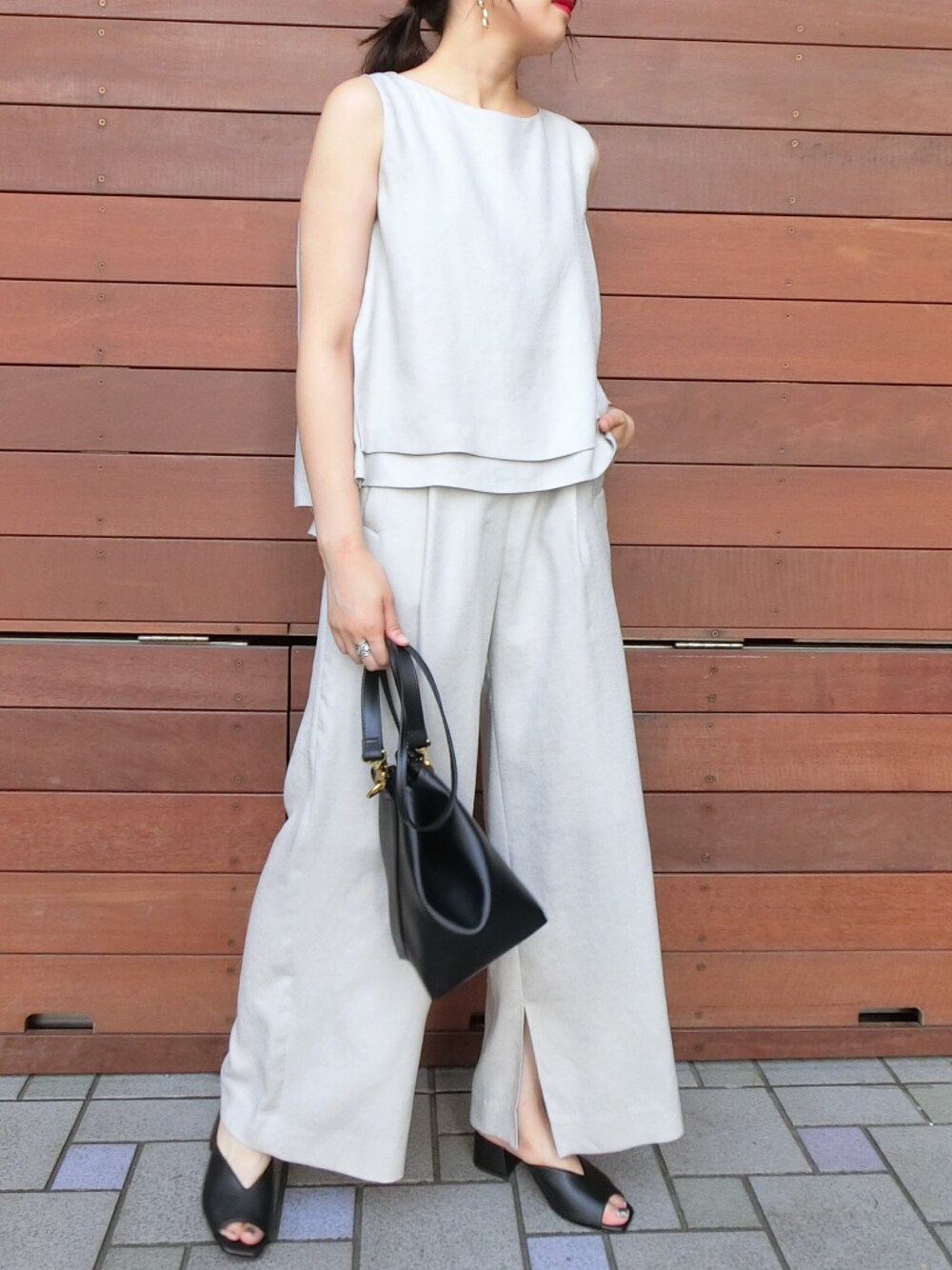 もうこれは着た瞬間、買うってなったやつ。笑 絶妙にきれいなライトグレーの色味と ワイドパンツは下にスリットが入っていて女性らしさをプラスしてくれます💄💕 セットアップ、いいですね♡♡ . いつも見ていただき、ありがとうございます😊 インスタのフォローもお願いします🙏🏻❤️ @momoko_jima