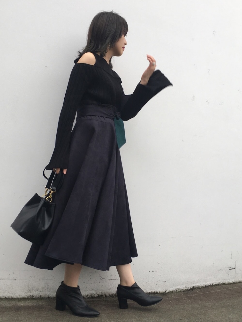 ブラックのワントーンで、 大人モードなデートスタイル😈💕 UNITED TOKYOのスカートはリバーシブルで、 この色は内側はミドリです❤️ 歩いたときにチラッと見えるので差し色感覚で♡ . いつもみていただき、ありがとうございます😊 インスタのフォローもぜひお願いします🙏🏻💓 @momoko_jima