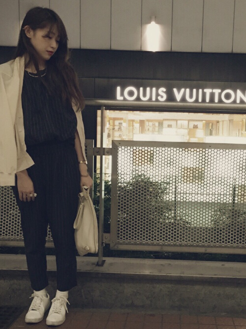 セットアップで、 大人めカジュアルにまとめました^ ^ カジュアル感を強くしたかったので 足元はスニーカーにしました👟 背景をハイブランドのとこで撮ってしまい背景負けしています、、笑