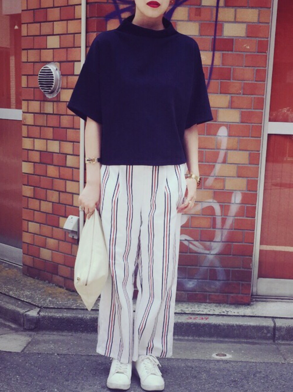 存在感のあるストライプのパンツを 主役にしたかったので、 他はシンプルにまとめました^ ^ トップスはネイビーを選び 大人目にしました。 ゆったりなボトム、きてます👍笑