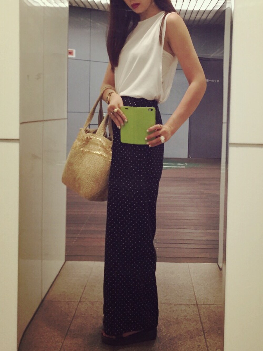 momocoのパンツ「ドットワイドパンツ」を使ったコーディネート