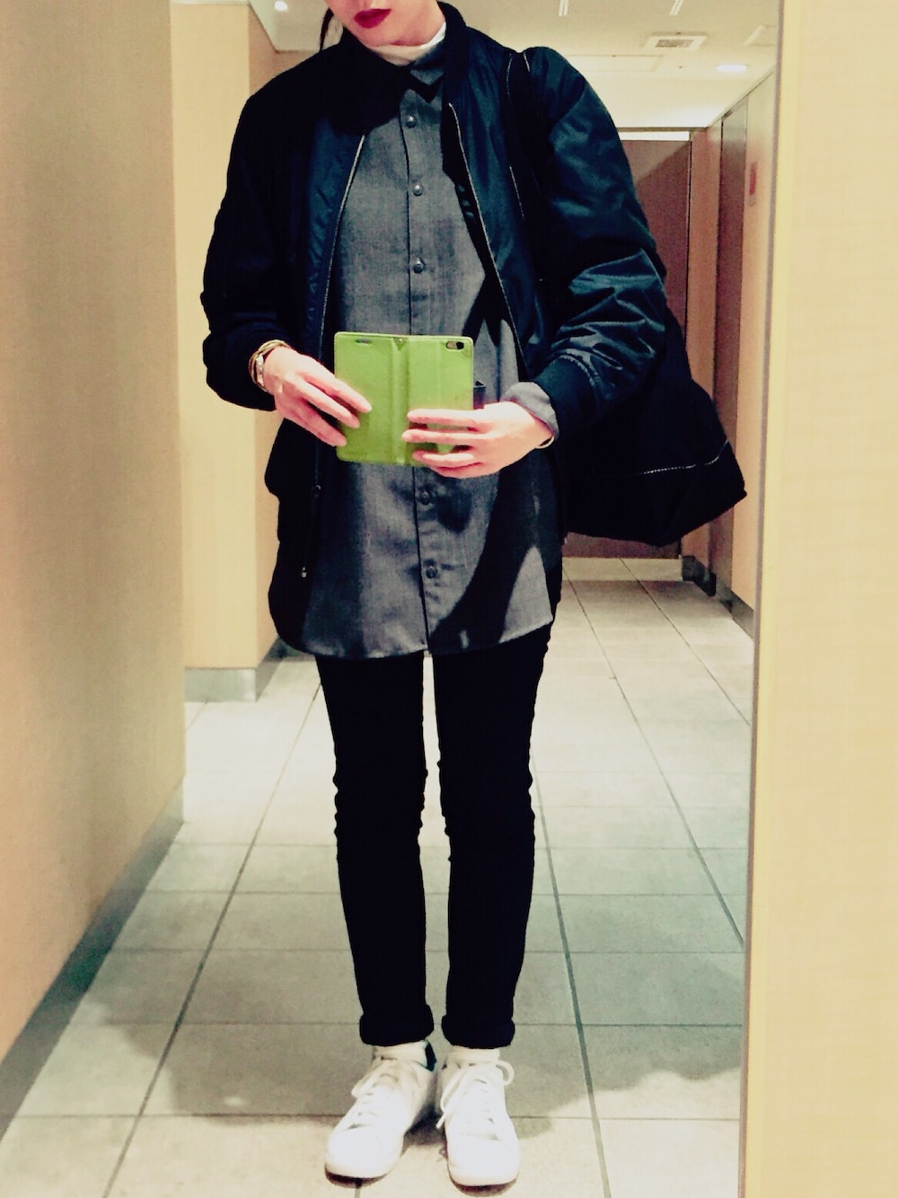全体的にモノトーンでシックにまとめました 👻✨✨ シャツに白のタートルネックをレイヤードして、こなれ感をだしたつもりです!笑 メイクは、ボルドーを使って女性らしさをだしています♪