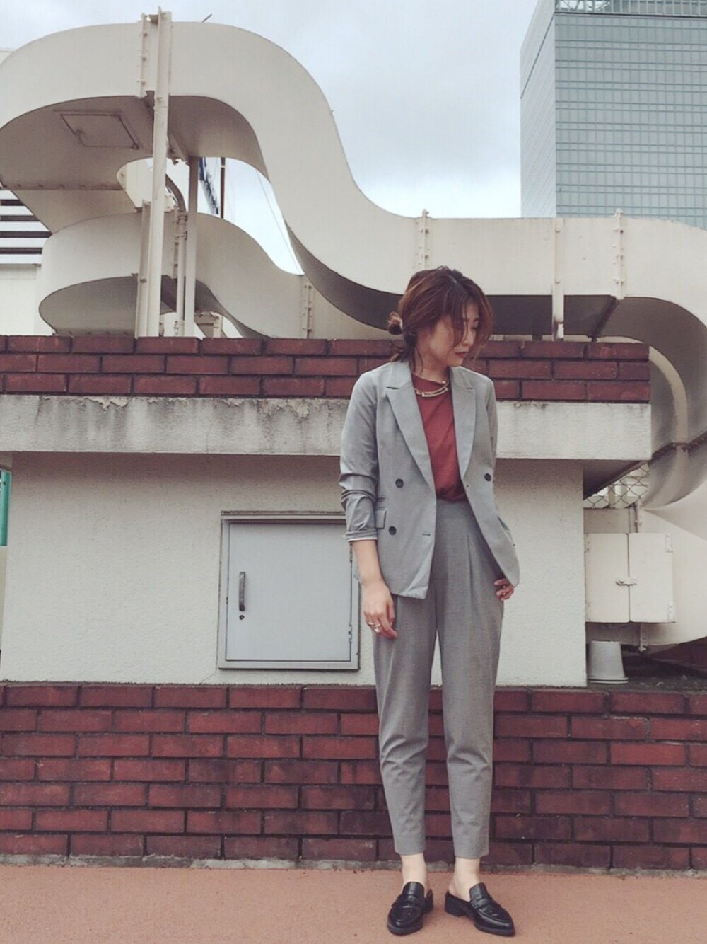 女性のダブルジャケット、、 かっこよくて素敵ですよね😍👌🏻 ライトグレーに流行りのテラコッタ色のインナーで、秋らしさを出しました☺️ この寒色と暖色の色味、綺麗です🍁💕 たまにはかっちりなスタイルもいいですよね?😏✨ . いつも見ていただき、ありがとうございます☺️🙏🏻