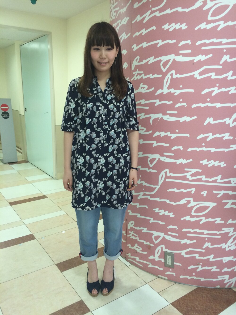 シックなお花柄のチュニックにデニムを合わせてカジュアルに◎