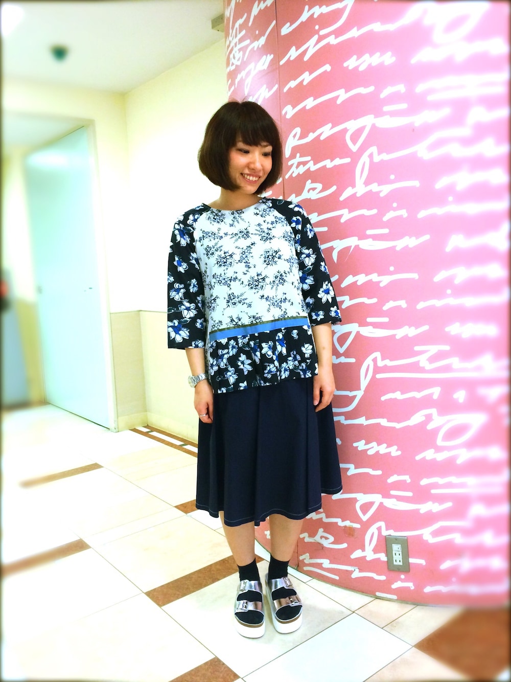 アズノゥアズらしいマゼコゼ柄のトップスに、プリーツスカートとシルバーのサンダルを合わせてトレンド感アップ◎