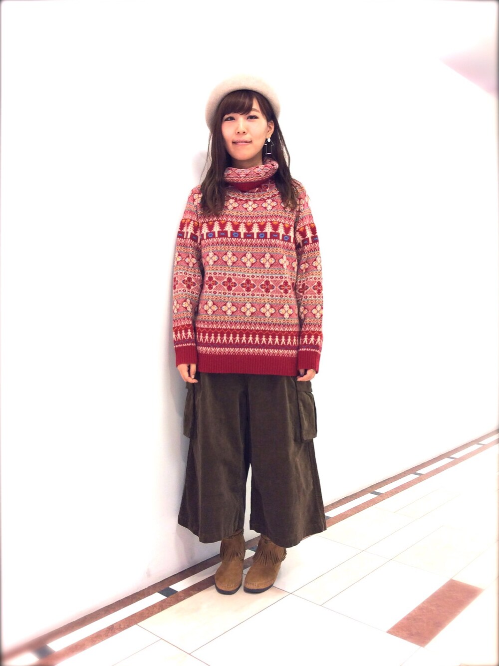 かわいいジャガード柄のニットを茶系のアイテムでまとめてほっこり秋冬コーデにしてみました(o´〰`o)