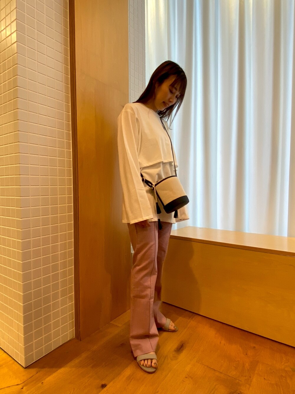 バケツ型のミニバッグは コーディネートのアクセントにもなり、 コンパクトに持つことができます。 サンダルはローヒールでシンプルなので カラーものとの相性も良いです^_^