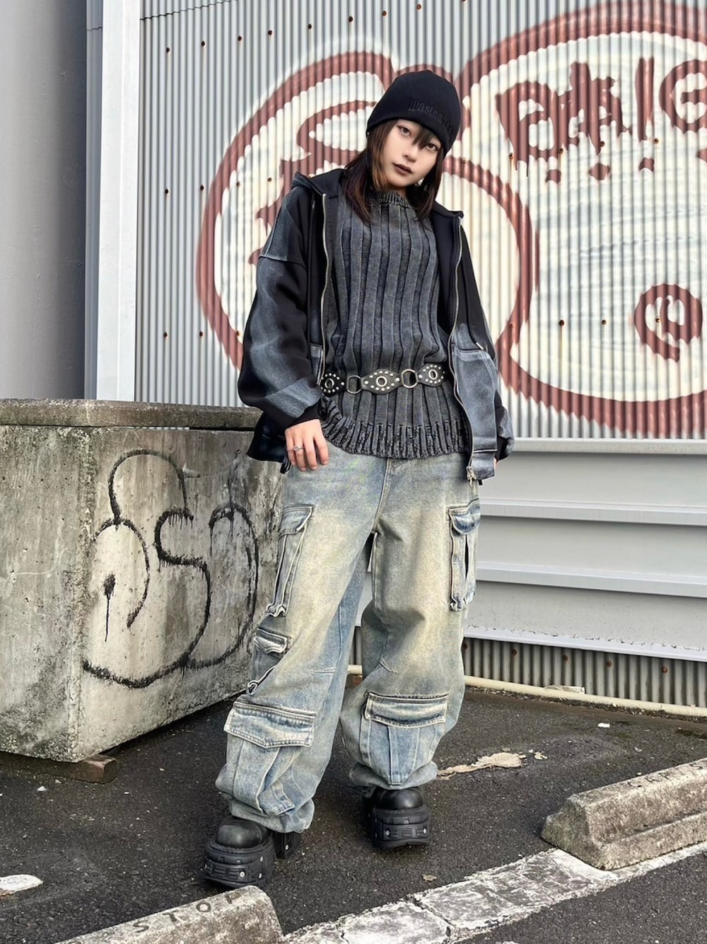 Never mind the XU / Chikashitsu+(Never mind the XU / Chikashitsu+)のデニムパンツ「【Never mind the XU】pocket cargo denim pants / 【ネバーマインド ザ エックスユー】ポケットカーゴワイドデニムパンツ」を使ったコーディネート