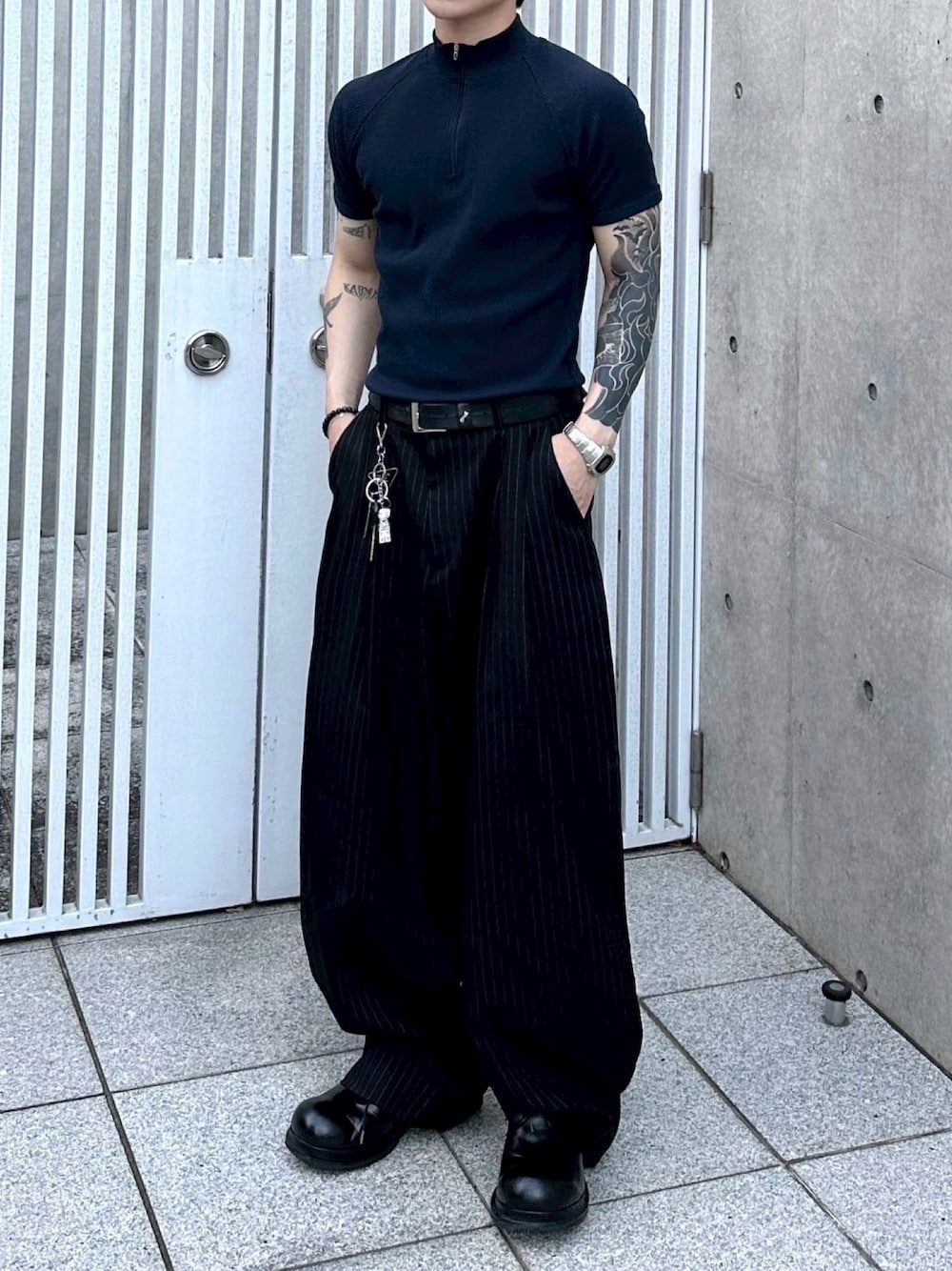 Never mind the XU / Chikashitsu+(Never mind the XU / Chikashitsu+)のTシャツ/カットソー「【Chikashitsu +】mockneck zip half sleeve t-shirt / 【チカシツプラス】モックネックジップ半袖Tシャツ」を使ったコーディネート