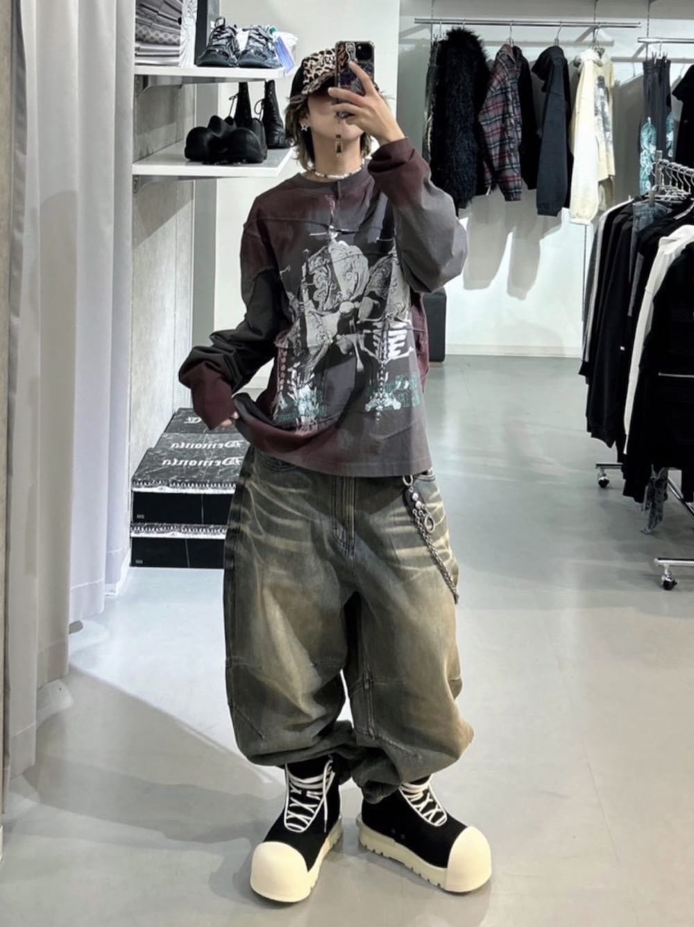 Never mind the XU / Chikashitsu+(Never mind the XU / Chikashitsu+)のデニムパンツ「【BLR BLUER】Embossed Wave Washing Wide Denim Pants / 【ビーエルアール ブラー】グランジウォッシングワイドデニムパンツ」を使ったコーディネート