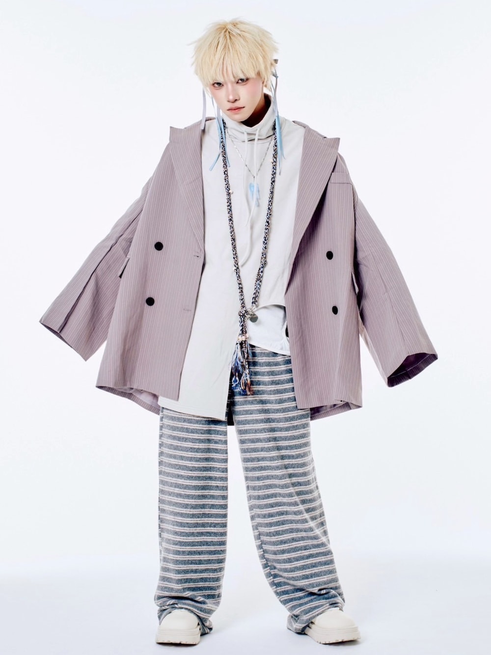 Never mind the XU / Chikashitsu+(Never mind the XU / Chikashitsu+)のテーラードジャケット「【Nerd out XU】big stripe tailored jacket / 【ナードアウトエックスユー】ビッグストライプテーラードジャケット <着用動画あり>」を使ったコーディネート