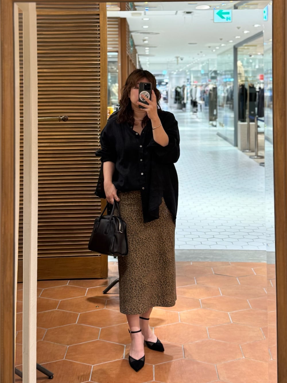 リネンシャツをレオパードスカートでアップデート。 一枚で主役になるスカートです。 秋になったらブーツ合わせも◎