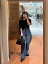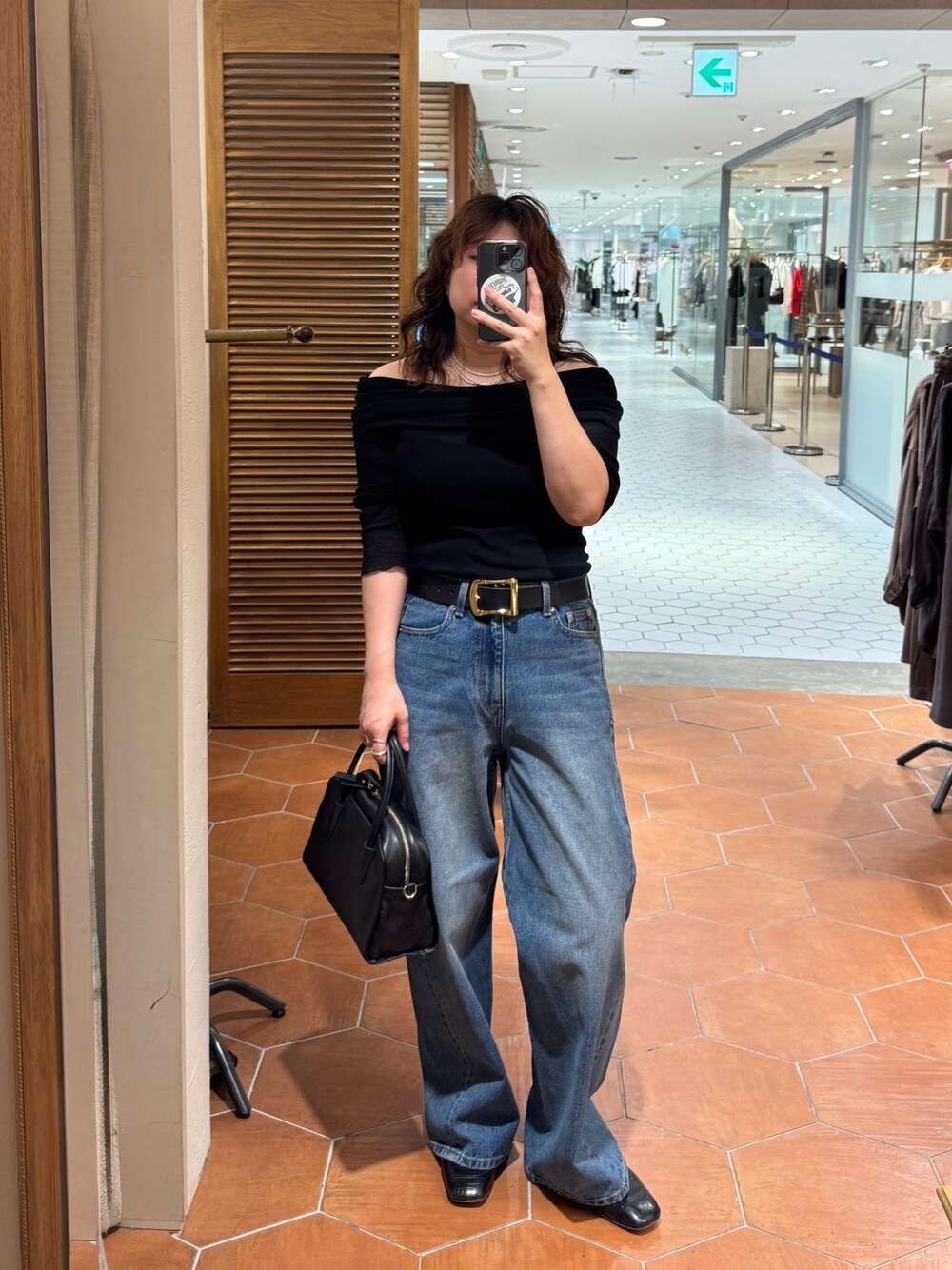 トップス:シアーテレコ生地で柔らかくて伸縮性があるので着やすいです。 オフショルダーで抜け感がでます。 パンツ:40size ゆるっと履けるデニムで切り替えがポイントです。