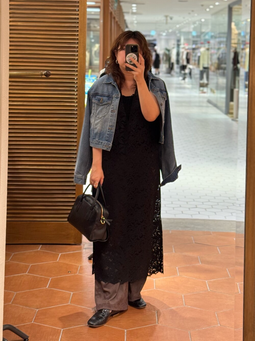 レースワンピースのレイヤードスタイルにデニムジャケットを合わせました。 デニムジャケットはコンパクトないシルエットなので、バランスがスッキリ見えます。