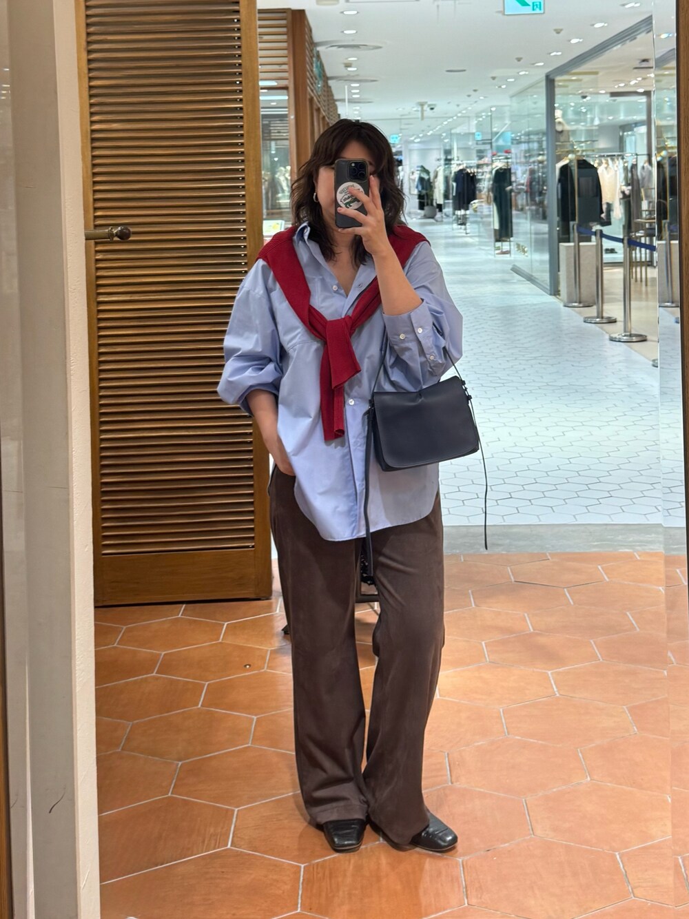 シルエットが綺麗なモンのシャツ! シワになりにくい素材なのも嬉しいです。 可愛いけど着るのはドキドキする赤ニットは肩掛けで差し色に!