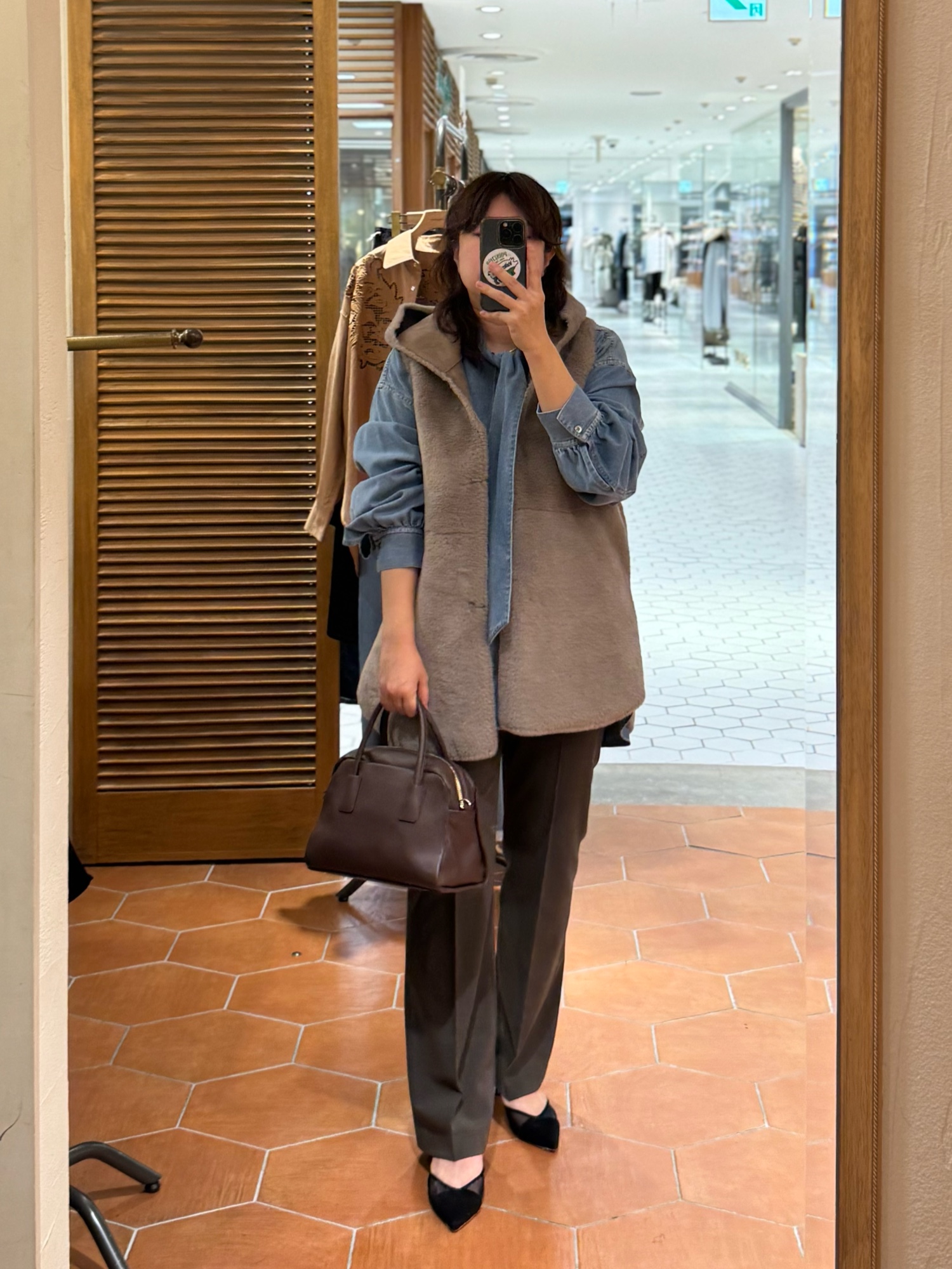 トップス:真面目になりすぎないデニムのボウタイブラウスです。 柔らかくて着心地よいです。 パンツ:美脚見えのフレアパンツ! お仕事でもカジュアルアイテムに合わせて普段使いにも。 ファーベスト:ボリュームが出過ぎず骨ストさんでも安心して着られます!