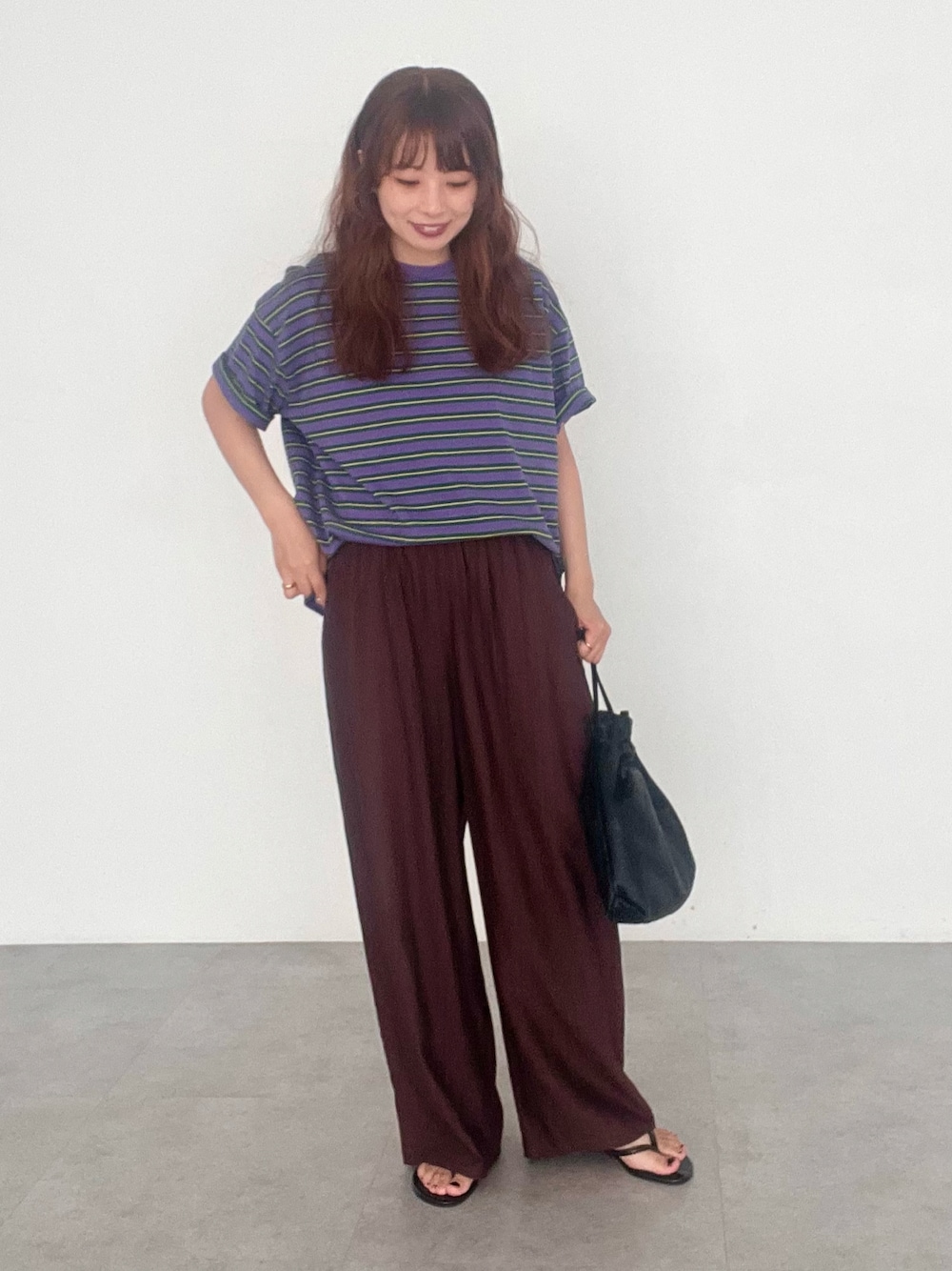 トップス:Mサイズ レトロな配色のボーダートップス。 ゆったりとしたサイズ感で体型カバーが叶います。 裾を折ってラフに着てみました。 ボトムス:Mサイズ 涼しげなワッシャー加工がポイントのパンツ。 夏に嬉しい接触冷感機能付き◎ さらっとした素材感でストレスなく穿いていただけます。 ゆったりとしたサイズ感です。