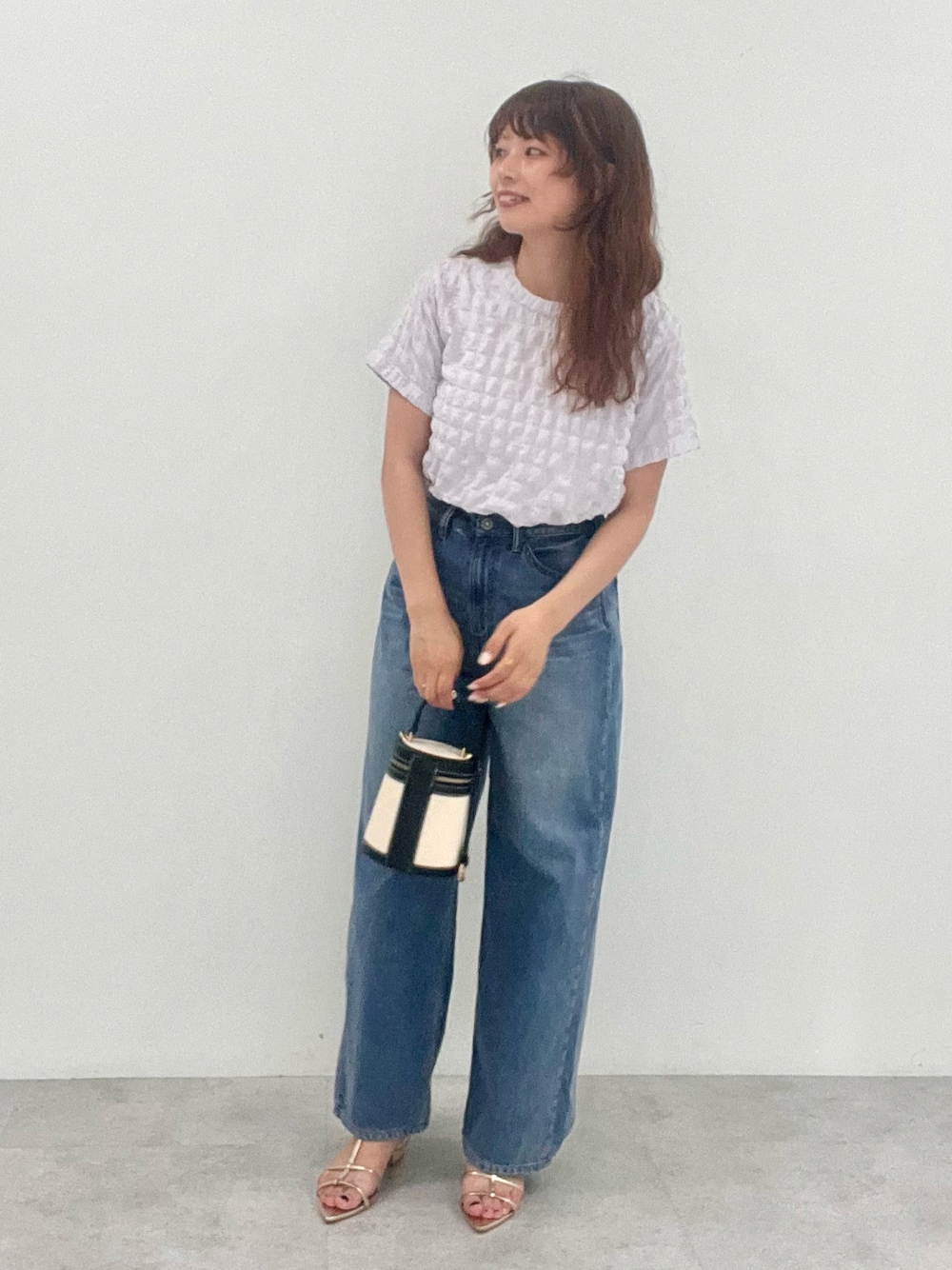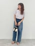 トップス:Mサイズ ぽこぽことした素材感がポイントのカットソー。 伸縮性のある素材なので着心地も良いです◎ 一枚でもサマになるデザイントップスです。 ボトムス:Mサイズ アメホリデニムからついに接触冷感素材のデニムパンツが登場! ワイドタイプなのでレッグラインを拾わずにきれいなシルエットで着用できます。 薄すぎず厚すぎずな素材感です◎