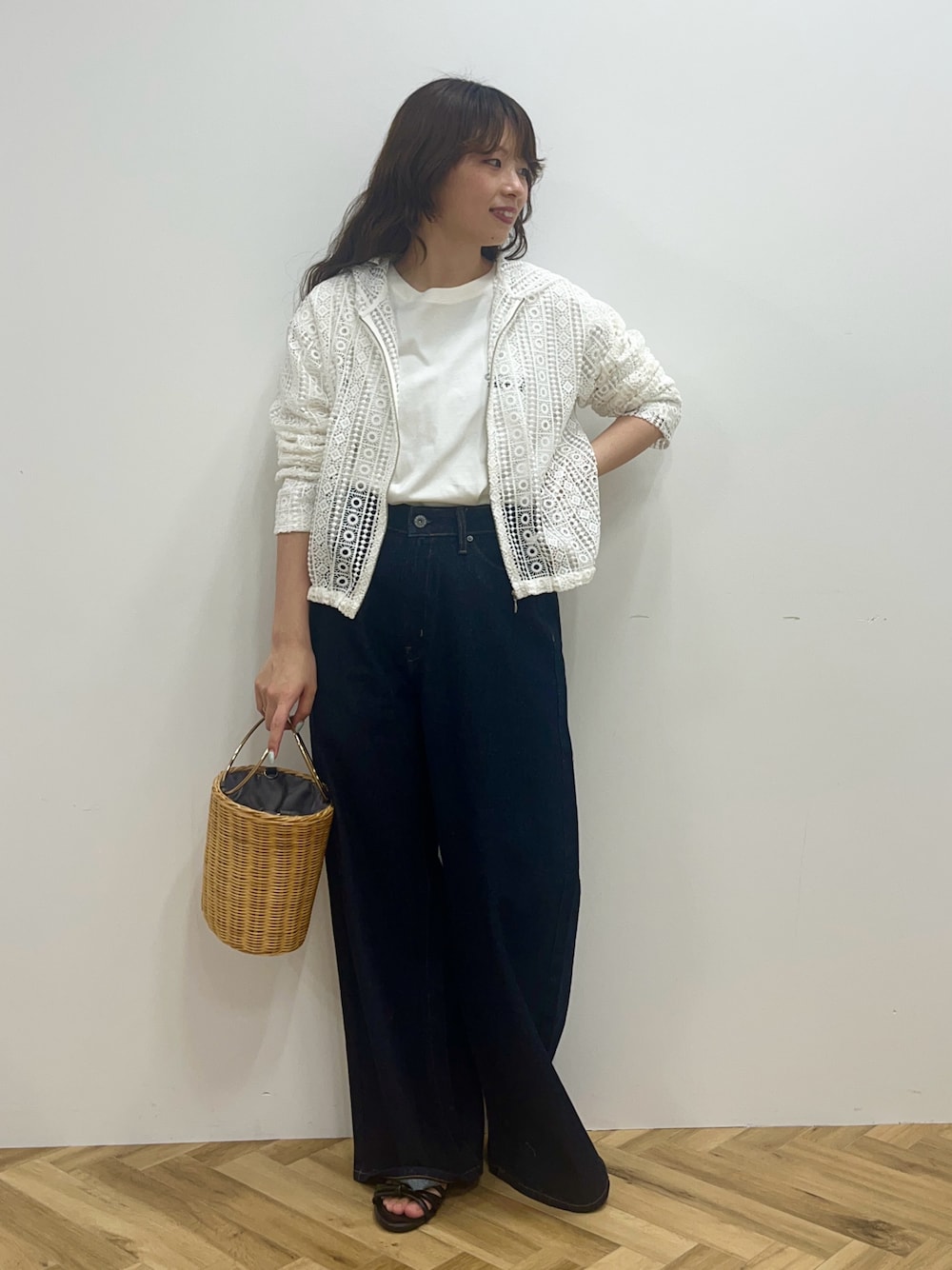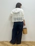 羽織り:M 幾何学柄のレースがポイントのフードパーカー。 ロゴTシャツを下に着ることでロゴが透けて見えるのがポイントです。 夏はタンクトップやキャミソールなどのインナーを着ても◎ カットソー:M バックのロゴプリントと刺繍がポイントのロンT。 タイトすぎず、リラックスして着ていただけます。 一枚で着るのはもちろん、レイヤードスタイルにもおすすめです。 ボトムス:M 程よくゆとりのあるワイドシルエットがポイントのデニム。 身体のラインを拾わないサイズ感で体型カバーも叶います◎