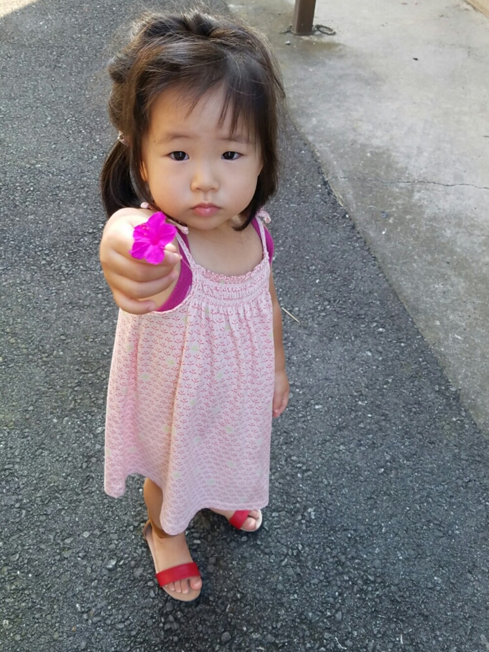 ご覧いただきありがとうございます✨ 皆さんのいいね!フォロー、コメントに励まされてます🎵 暑くて暑くて… コーディネートどころではなく簡単で涼しいカッコになってしまいます💧 赤ちゃんのコーナー(?)で赤ちゃん(笑)の時に買ったワンピース✨夏の夕方や夜に着せたくなる感じ😁 暑くて今日は夕方お散歩👣 朝顔の花がしおれててガッカリしちゃったけどおしろい花がたくさん咲いててご機嫌⤴ ワンピースの下に着たキャミソールのピンクと同じ色で更にテンションup⤴⤴⤴