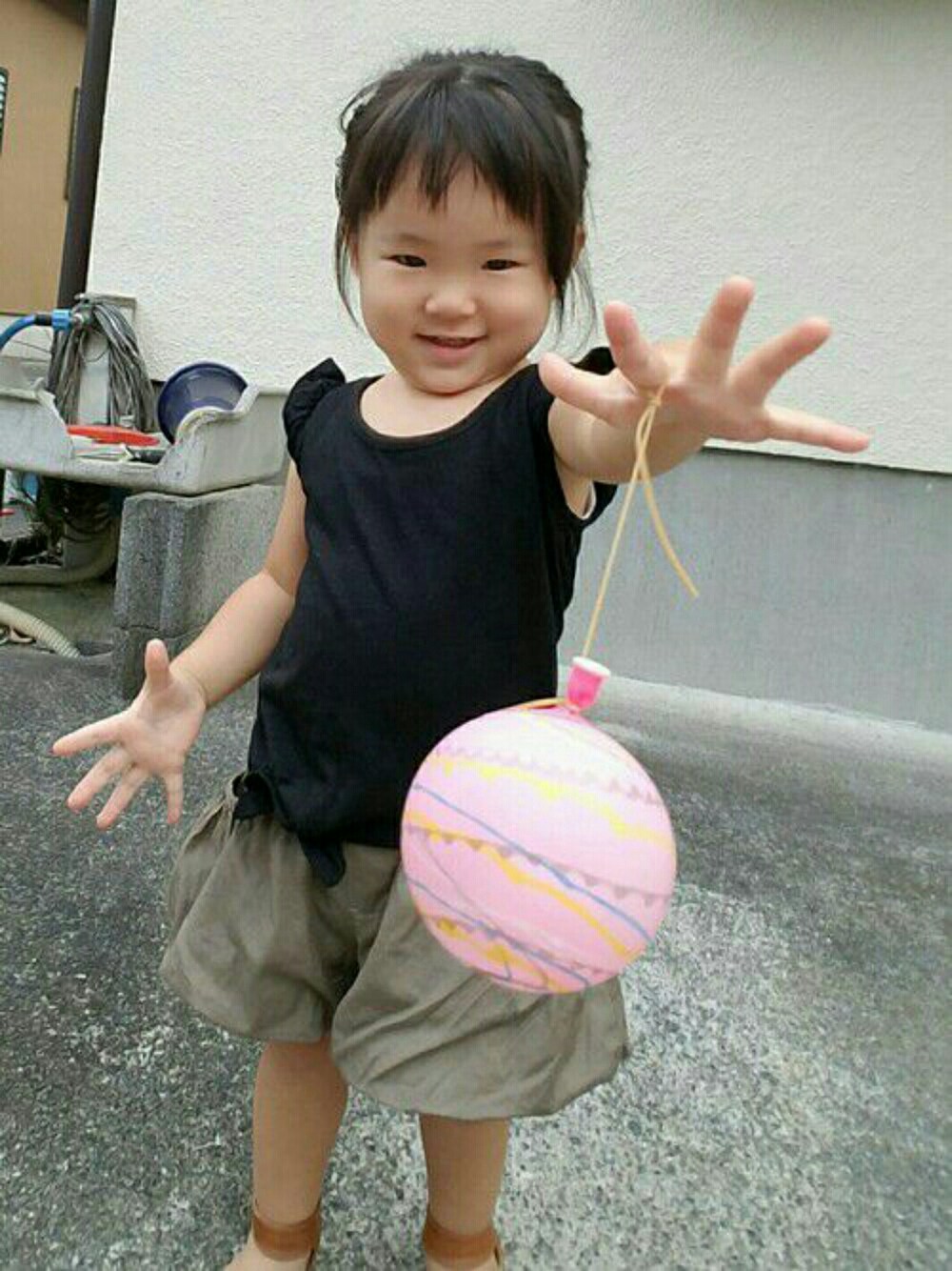 あまり好きじゃない地味色コーデ ちょっとしたおリボンとちょっとしたフリルとばあばにかわいいねって言われて納得したらしい😅 バルーンになったパンツのシルエットがかわいいよ✨ ヨーヨーもやっぱりピンク! 皆さんのいいね!フォロー、コメント、SAVE嬉しいです❤
