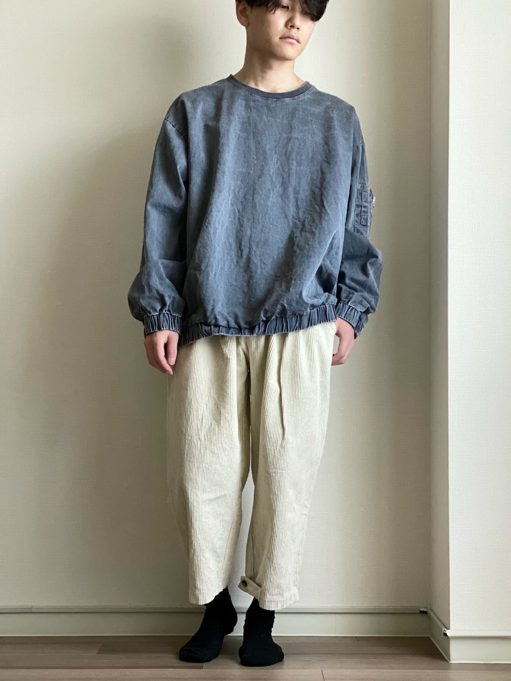 「プルオーバー x コーデュロイパンツ」 ご覧いただきありがとうございます。 よく行くセレクトショップの服で上下組んでみました。上がかなりオーバーサイズでゴツい印象なので、下はくるぶしがはっきりでるパンツにしています。