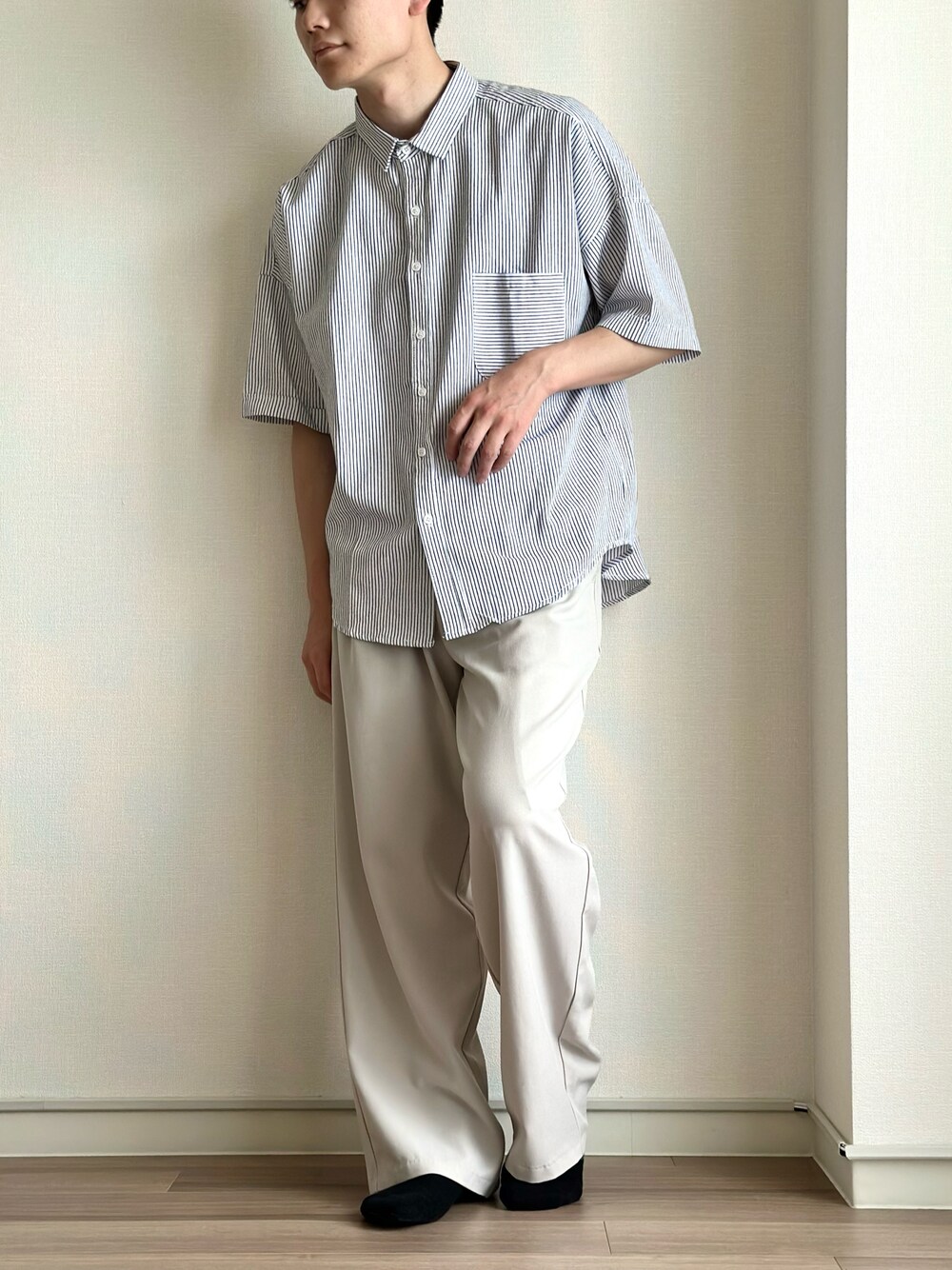 「ストライプシャツ x ワイドパンツ」 (夏服の思い出投稿) ご覧いただきありがとうございます。 上下白色ですが、上はストライプ柄で合わせてみました。色味は似ていますが、上下で素材感がかなり違うので、凝った涼しげな印象かなと思います。