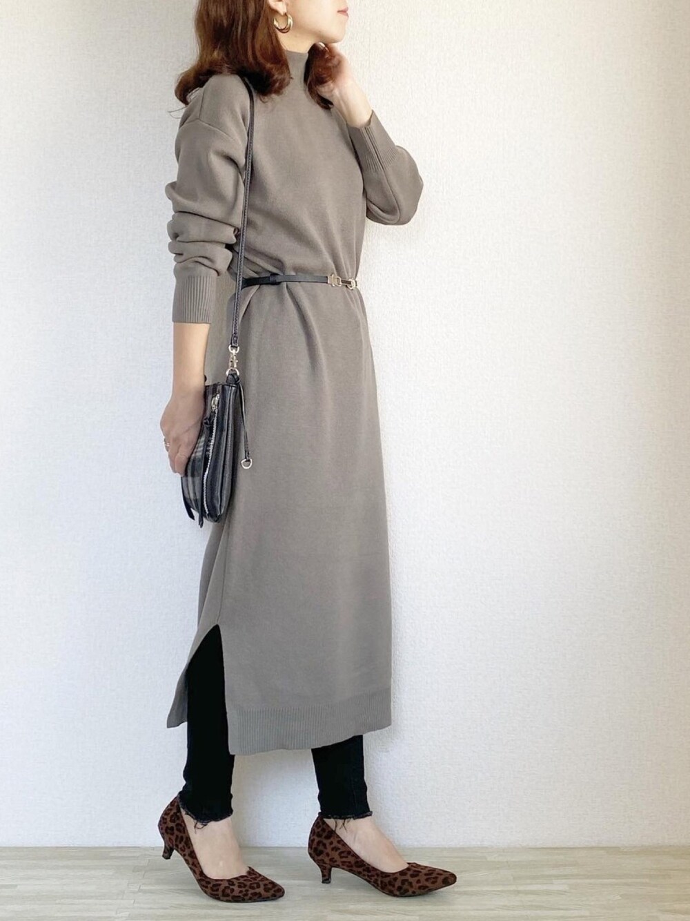 着心地ホント良くてこのシリーズ好きです♡ 一度触ってみて欲しい! ただ、首は詰まってるタイプのハイネックなので 締め付けが苦手な方は気になるかも。 サイズは結局Sを買いました。 2サイズくらいUPして体型拾わないようにしても可愛いけど 丈感が変わってしまうので、私はこのくらいがいいかなーと。 1枚でももちろん可愛く着れるんですけど サイドスリット深めなので、気になる方はご注意‼︎ ただ、デニム履いたりしてサイドから覗かせるのもカワイイ⭐︎ 今回は黒のスキニーデニム、黒のビットベルト、 黒のバッグ、レオパード柄のパンプスで カッコイイ感じを目指してみました(*´罒`*) 通勤コーデにしてもよさげ♫
