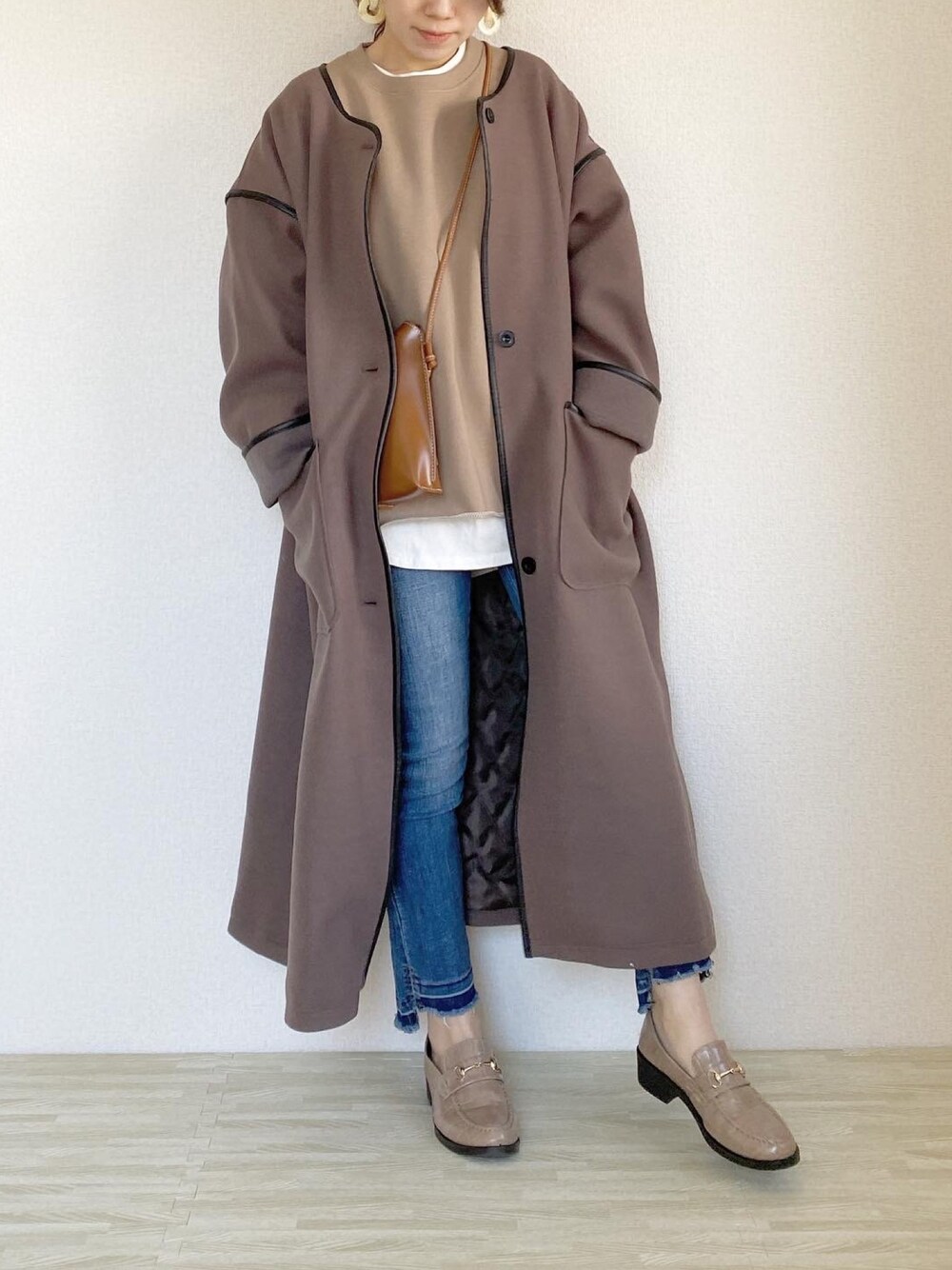 Nanaのノーカラーコート「【裏地キルティング付】ノーカラーパイピングガウンコート【低身長向けSサイズ有】」を使ったコーディネート