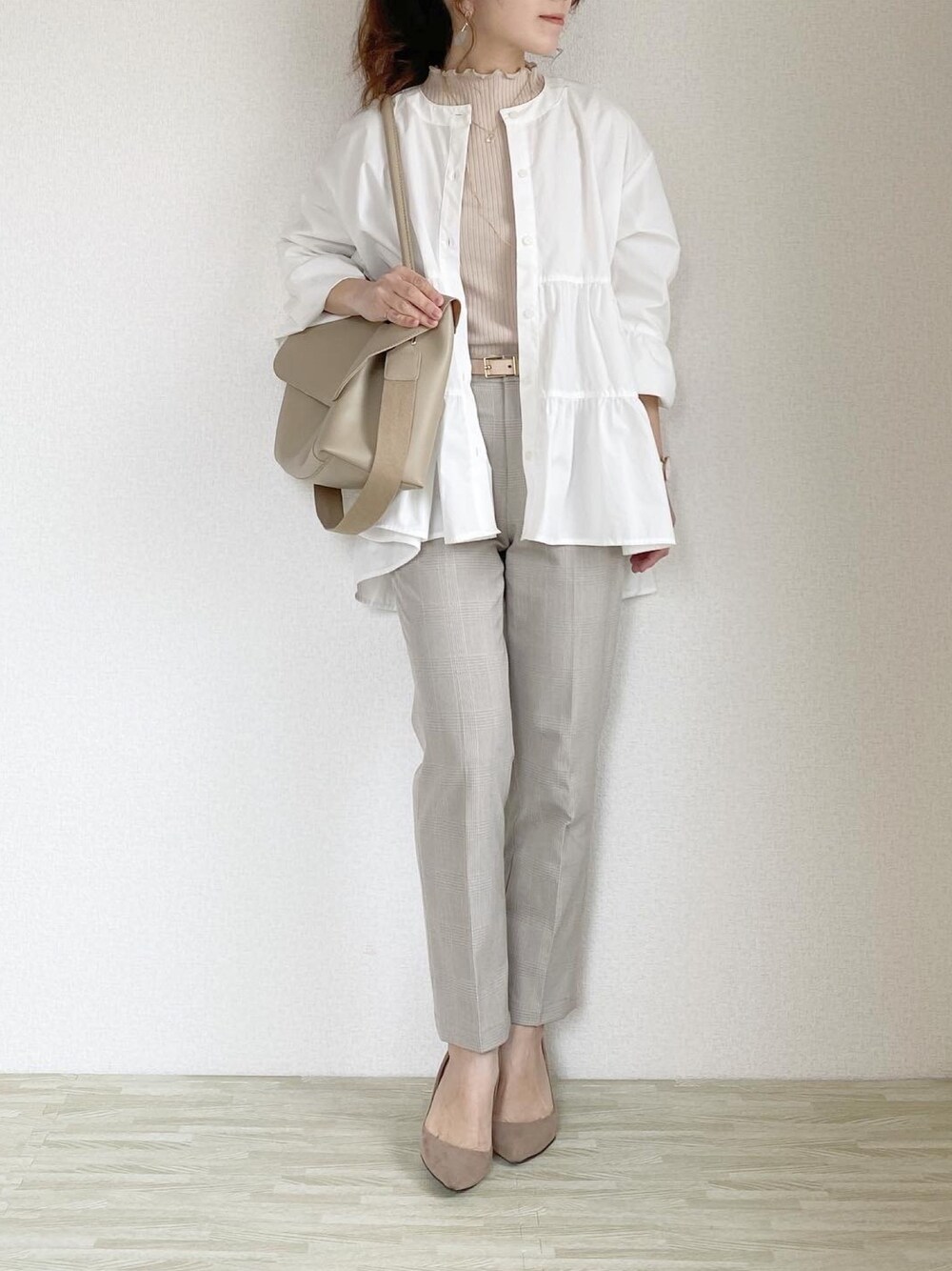 ご覧いただきありがとうございます◟̆◞̆* お気に入りのティアードブラウスを 羽織りとして着ました♪ ベージュトーンできれいめにまとめたら お仕事もぜんぜんOK⭐︎ 横から見たときもかわいい( *´艸`)